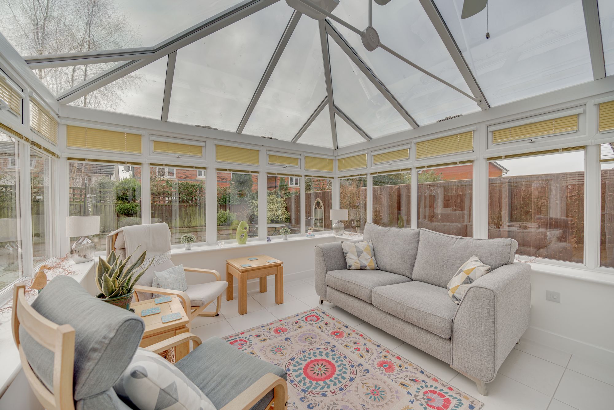Bi-folding doors open into a generous, heated conservatory that feels more like an additional living room. From here, French doors lead onto a large terrace and landscaped garden with artificial lawn and modern sleeper planters, creating a low-maintenance outdoor space ideal for barbecues, playtime, and summer gatherings. Together, the kitchen, conservatory and garden create a seamless indoor-outdoor lifestyle thatโs easy to enjoy all year round.