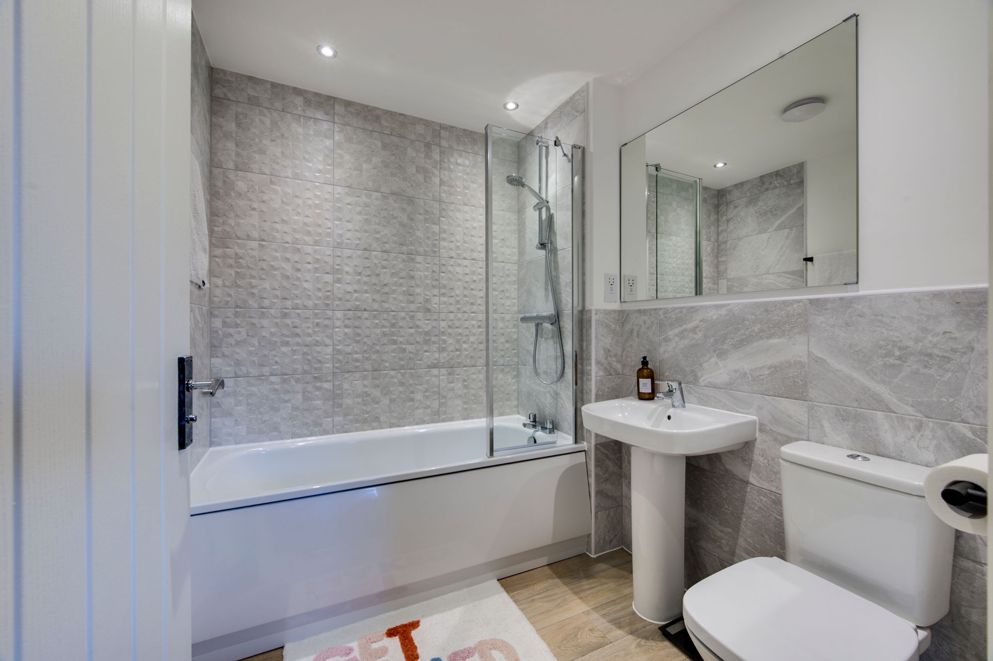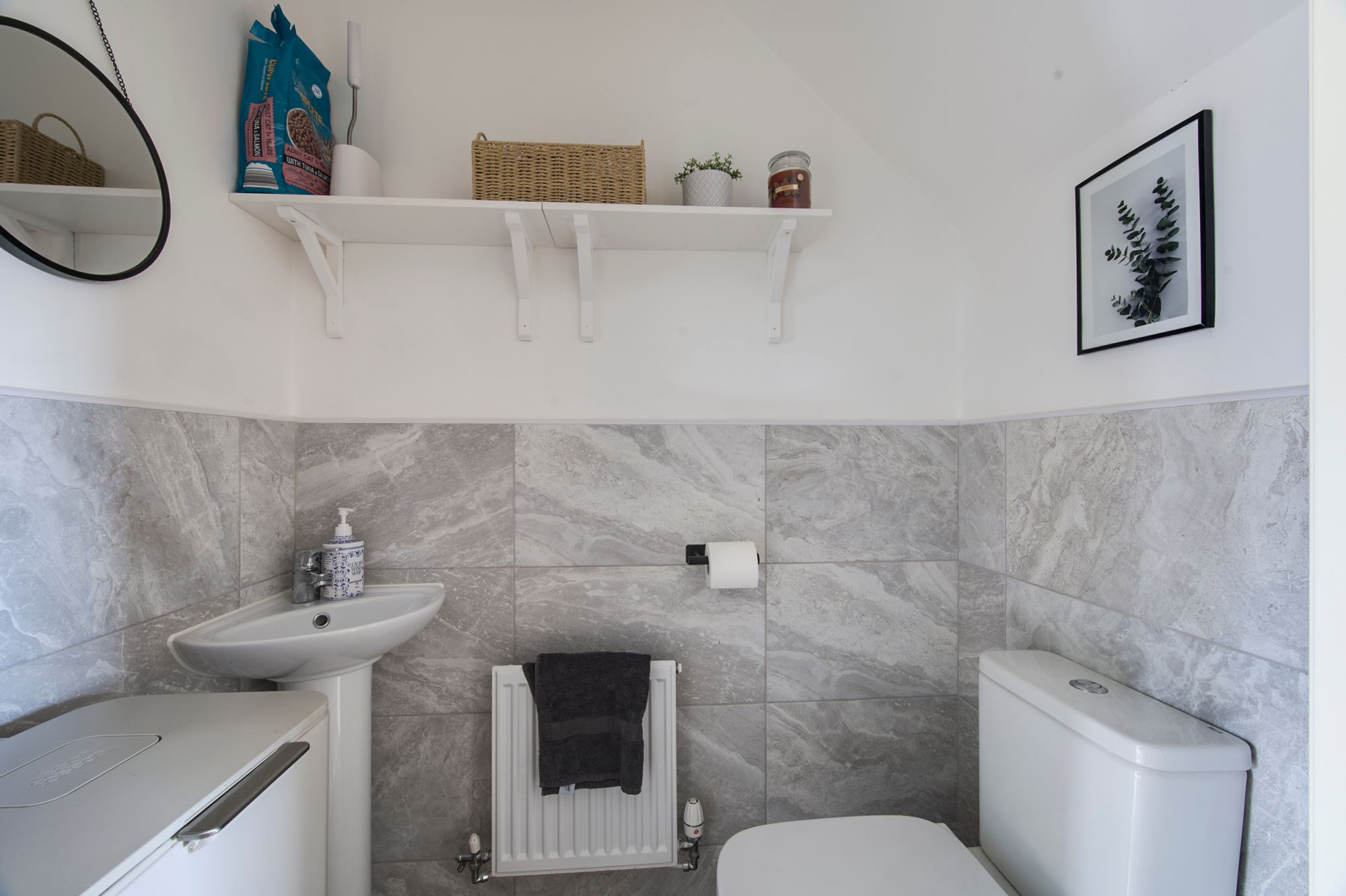To the first floor, there are two generous double bedrooms with bedroom two having useful store plus a range of built-in wardrobes! The family bathroom can be found on this floor with beautiful upgraded tiling, inset spotlights and branded ‘Roca’ sanitary ware.