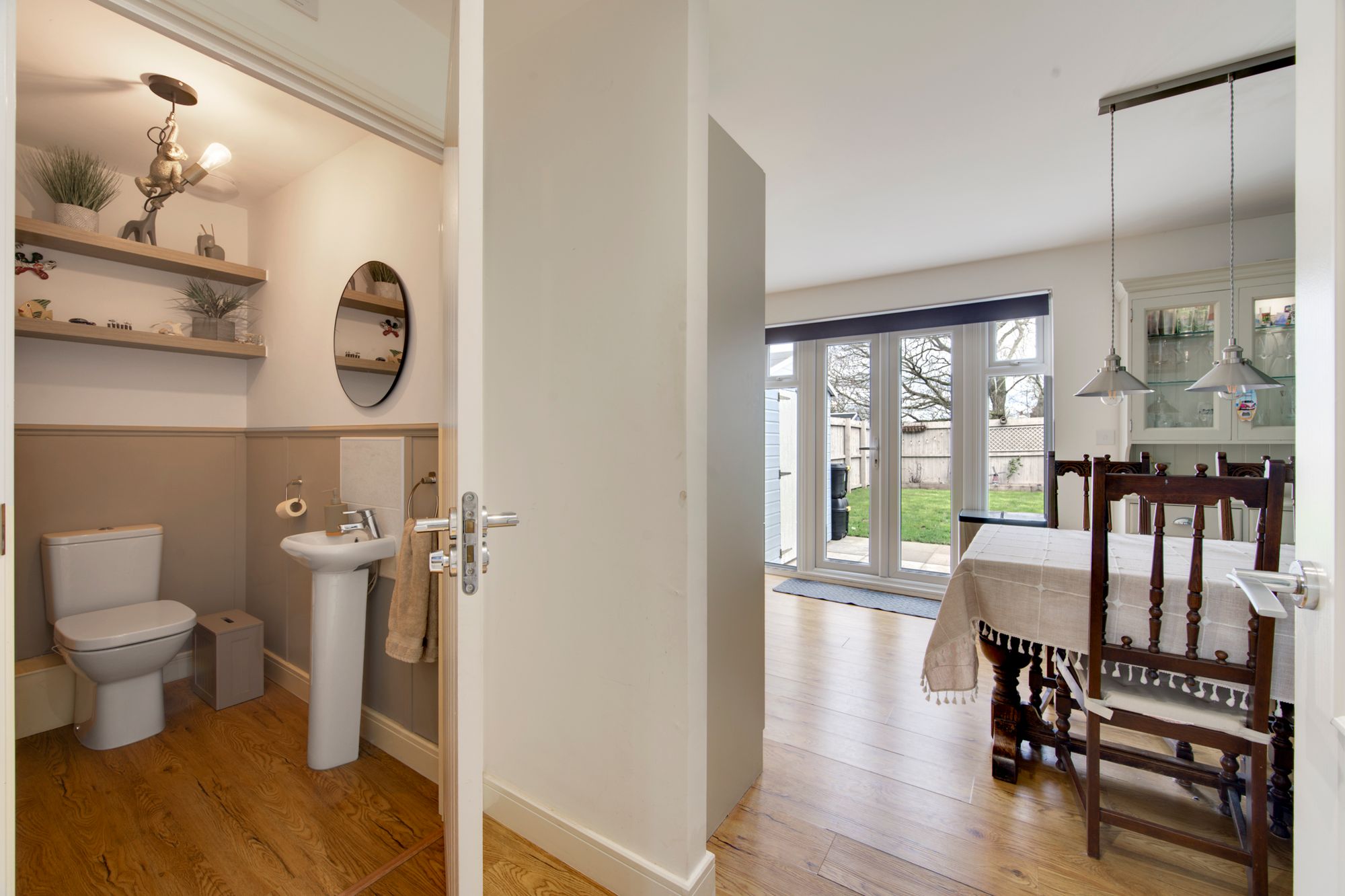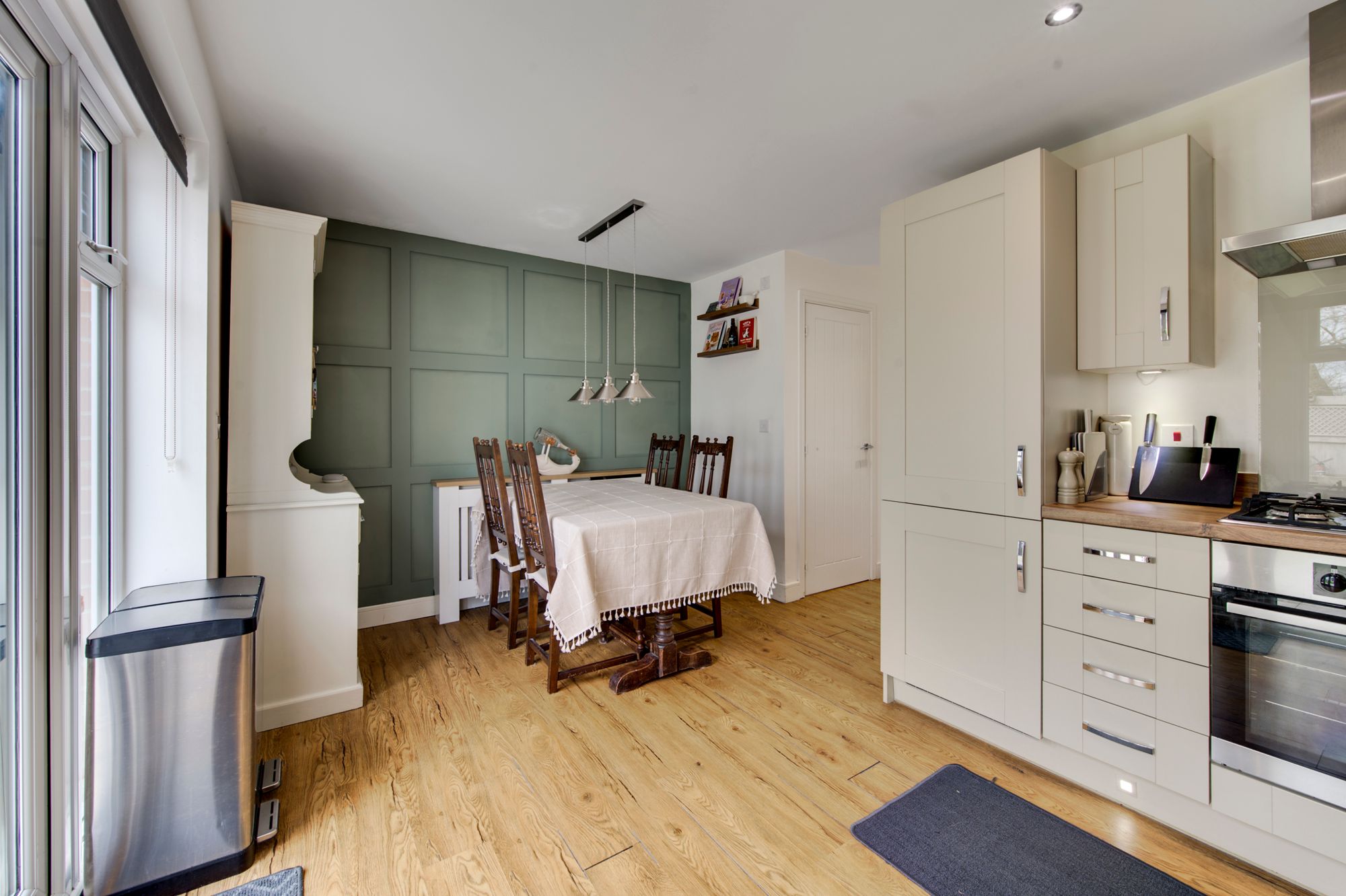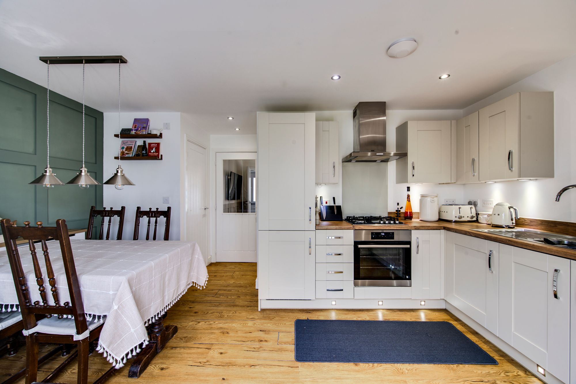 Upon entering, you will find two spacious reception rooms that provide ample space for relaxation and entertaining guests. The open-plan kitchen-diner towards the rear of the home offers a lifestyle we all desire nowadays, with its timeless โshakerโ style kitchen units, integrated AEG appliances complementing LVT-style flooring, wall panelling and French doors leading to the rear garden. There is also a stylish downstairs WC and really useful storage/utility space under the stairs.