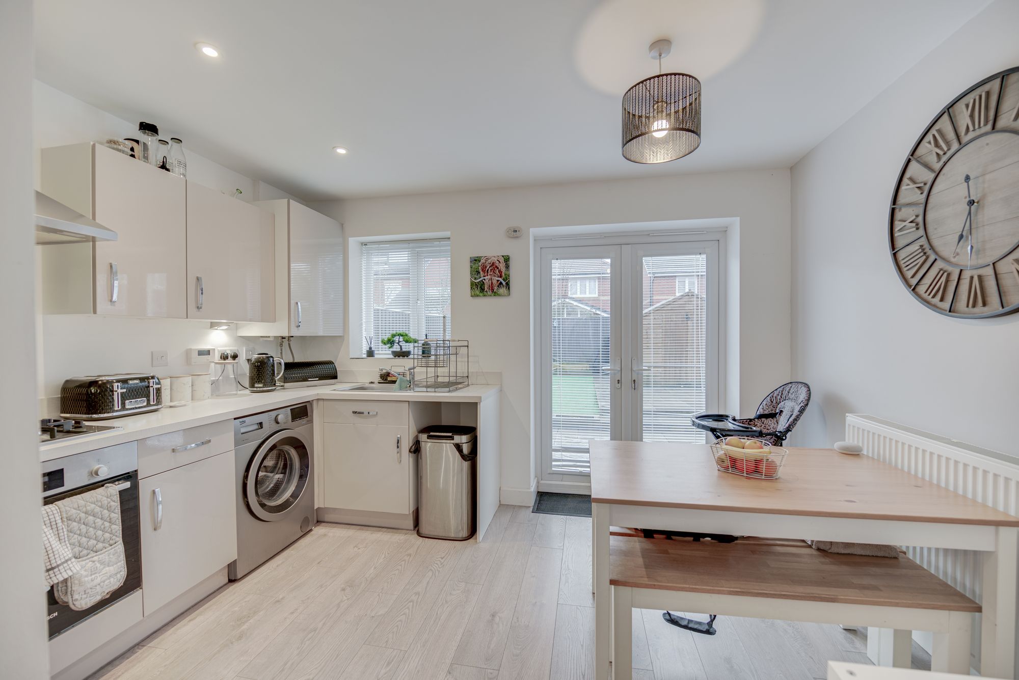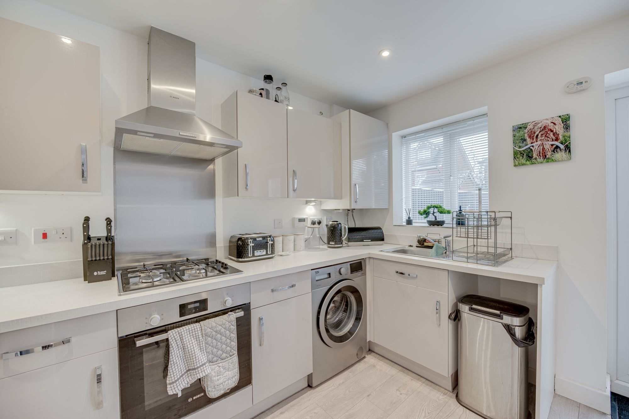 Inside, the home is immaculately presented and finished to a high specification throughout. A charming canopy porch leads into a bright and elegant lounge which features a striking bay window, creating a warm and inviting atmosphere. A welcoming hallway with deep storage and a convenient ground floor WC leads through to the rear. At the rear is a stylish kitchen/dining area which enjoys garden views and features impressive external doors, seamlessly connecting indoor and outdoor living—perfect for socialising and family life.
