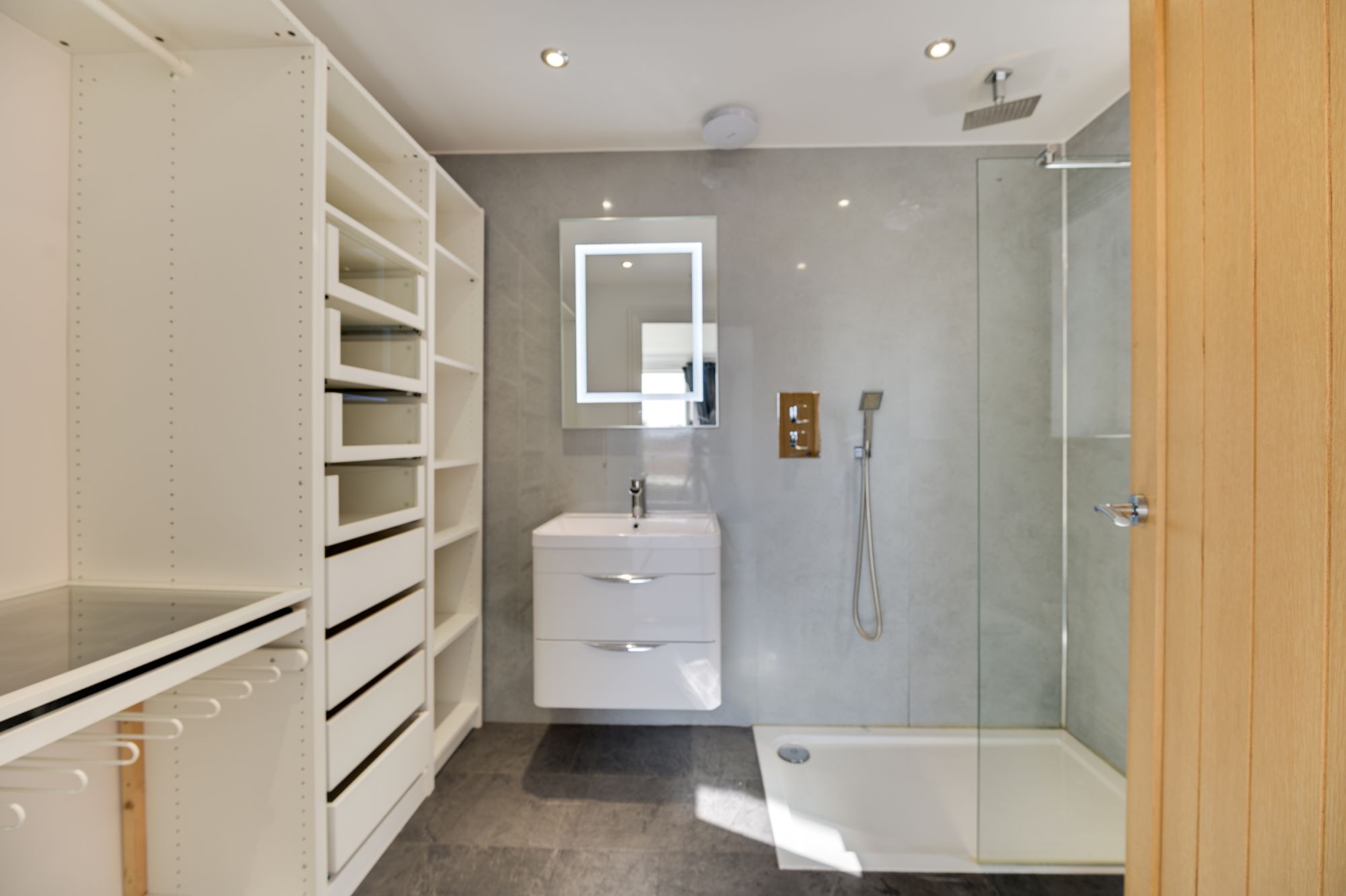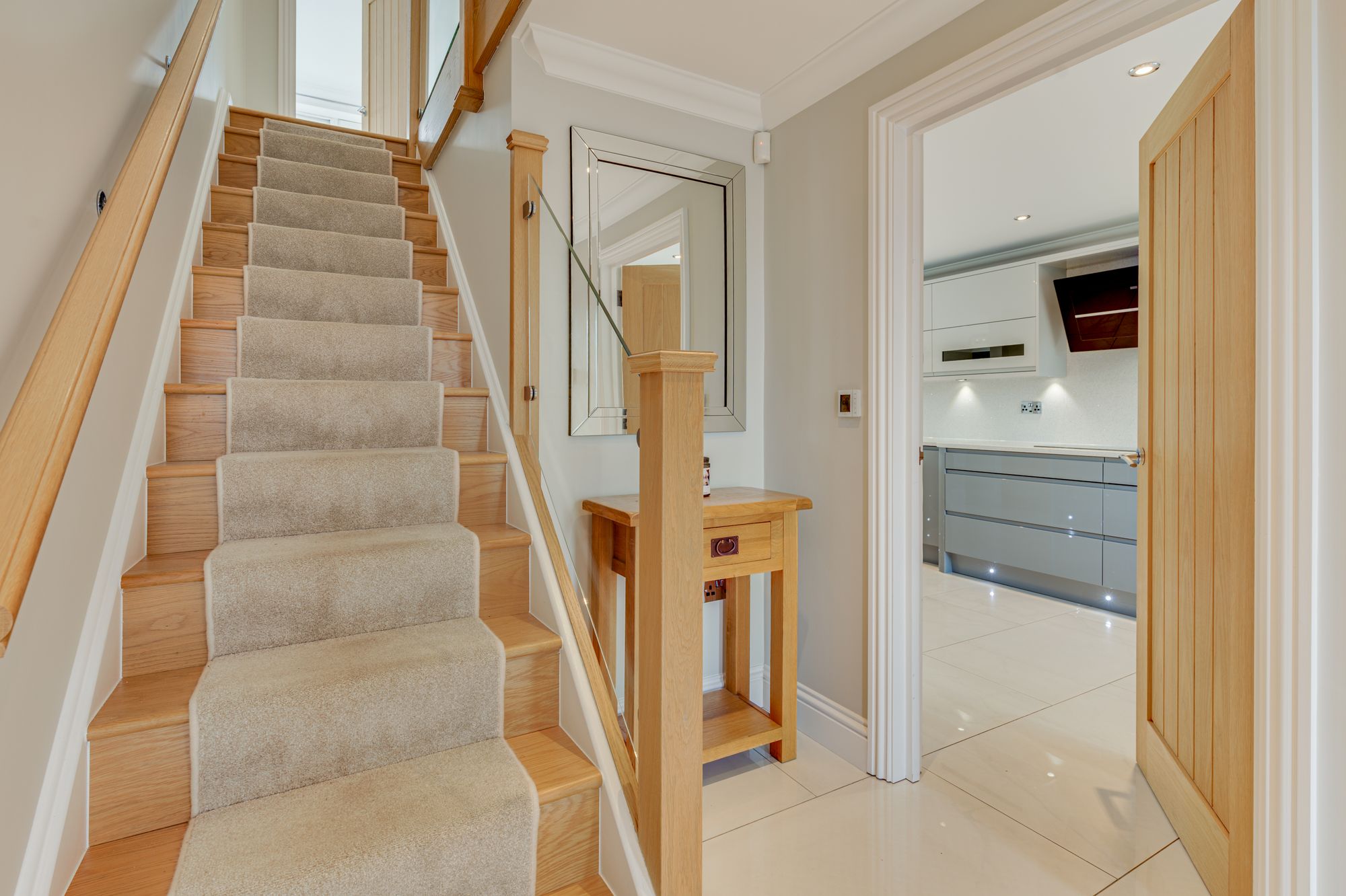 Upstairs, the first floor offers three well-balanced bedrooms, two of which benefit from en-suite shower facilities plus a well appointed family bathroom with stylish split-face tiling and designer freestanding bath. The principal suite occupies the entire top floor and includes air conditioning, access to a stunning balcony with superb vistas over the adjacent Cheshire farmland. Completing the package is an en-suite shower room/walk-in dressing room with plenty of built-in wardrobes and storage, keeping the entire space organised – a real treat for the mortgage payer.
