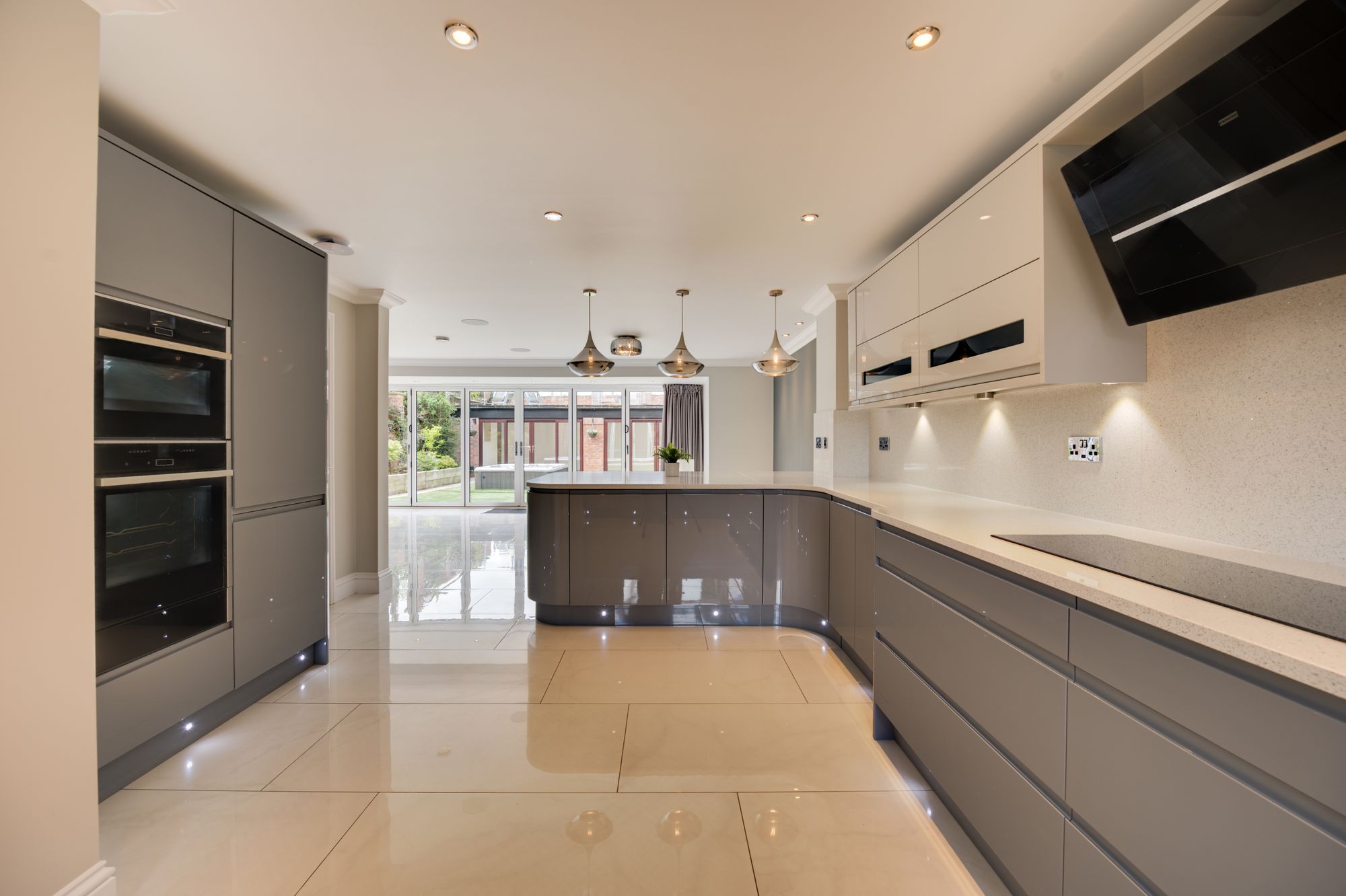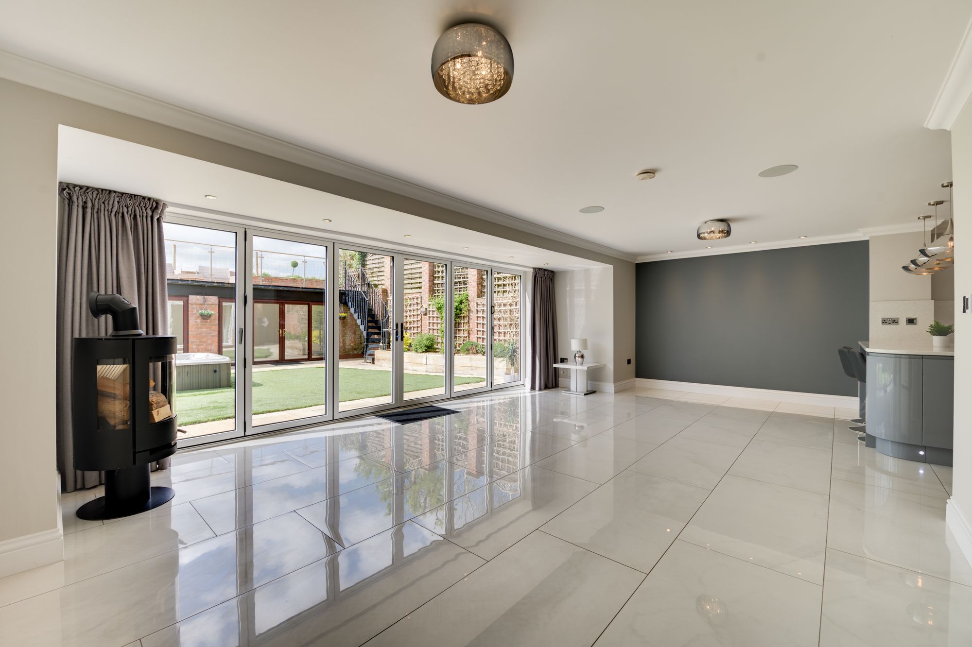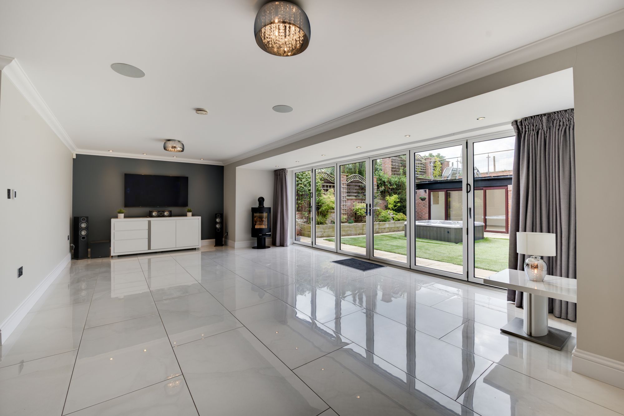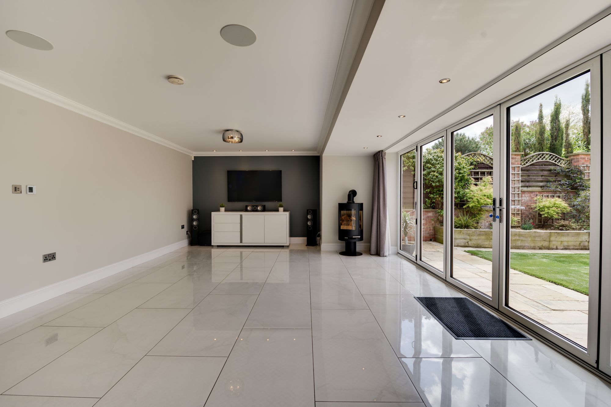 The heart of the home is the impressive open-plan living/kitchen-dining area, featuring full-height glazing and bi-fold doors opening onto a south-facing garden. The kitchen enjoys a wealth of Quartz preparation surfaces and upstands, a full range of integrated appliances (including a wine chiller and instant boiling water tap), creating a modern, functional and stylish entertaining space – for those who love to entertain, this will be the perfect place for all friends and family to get together.