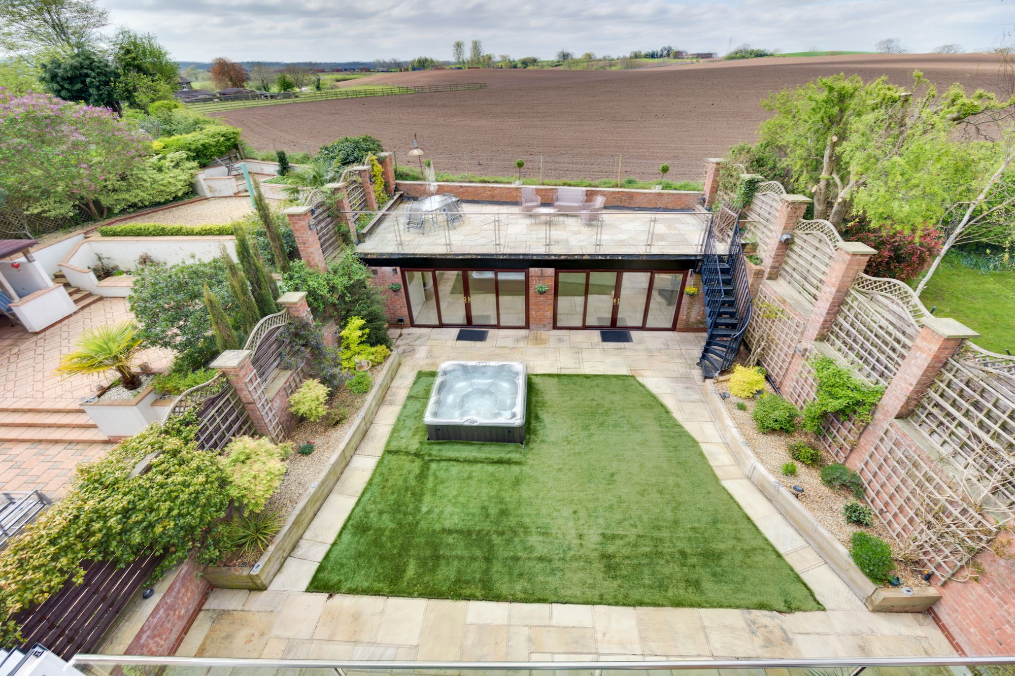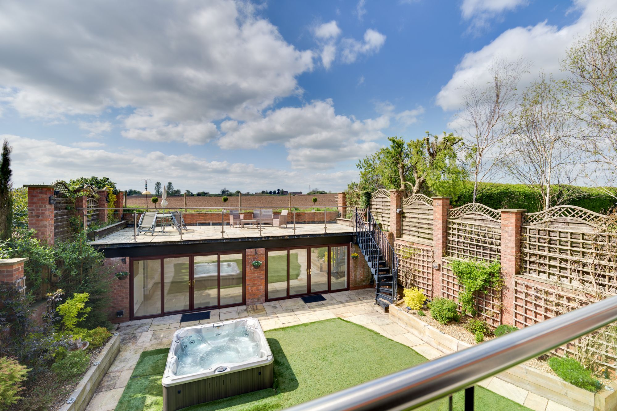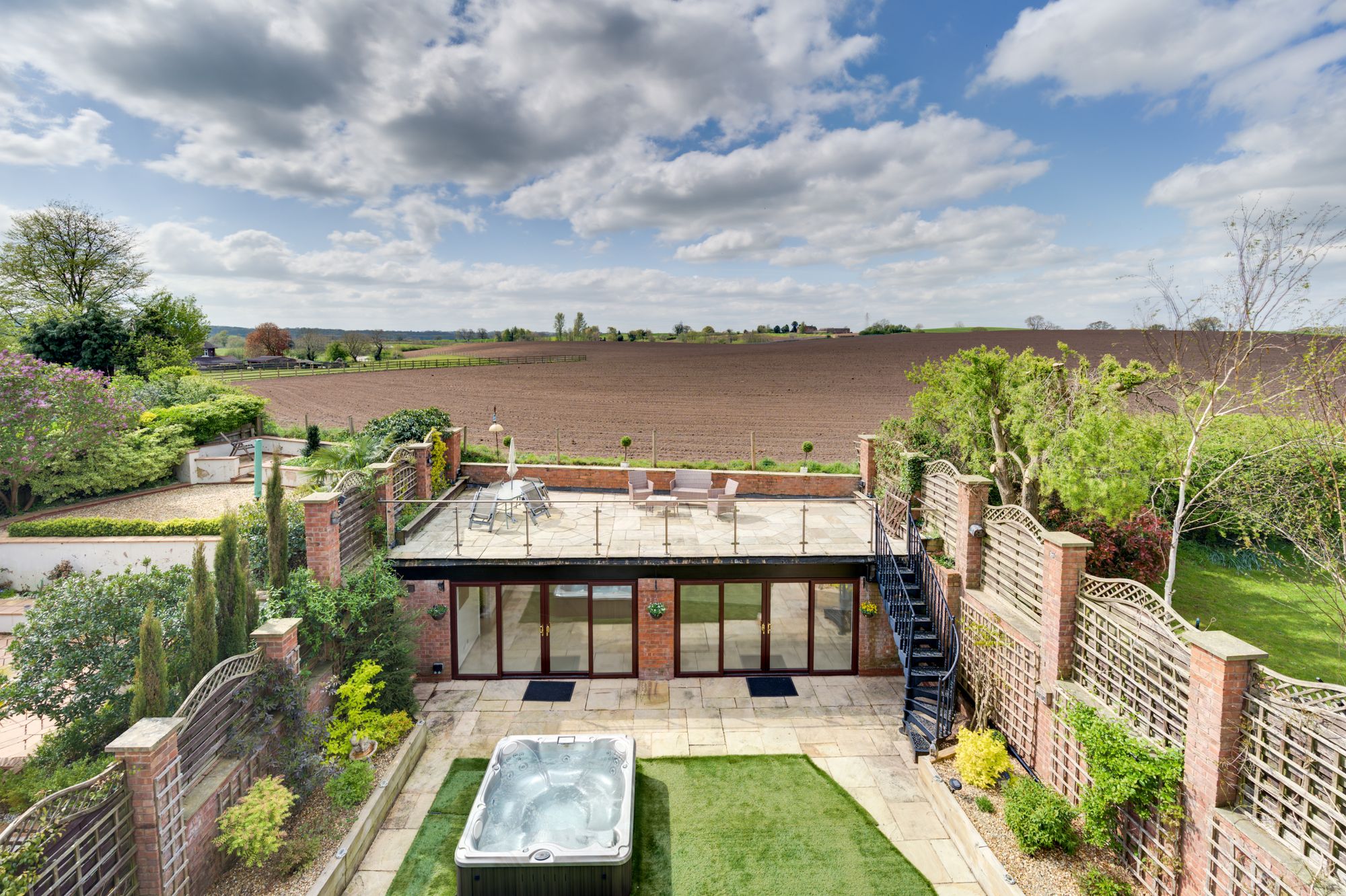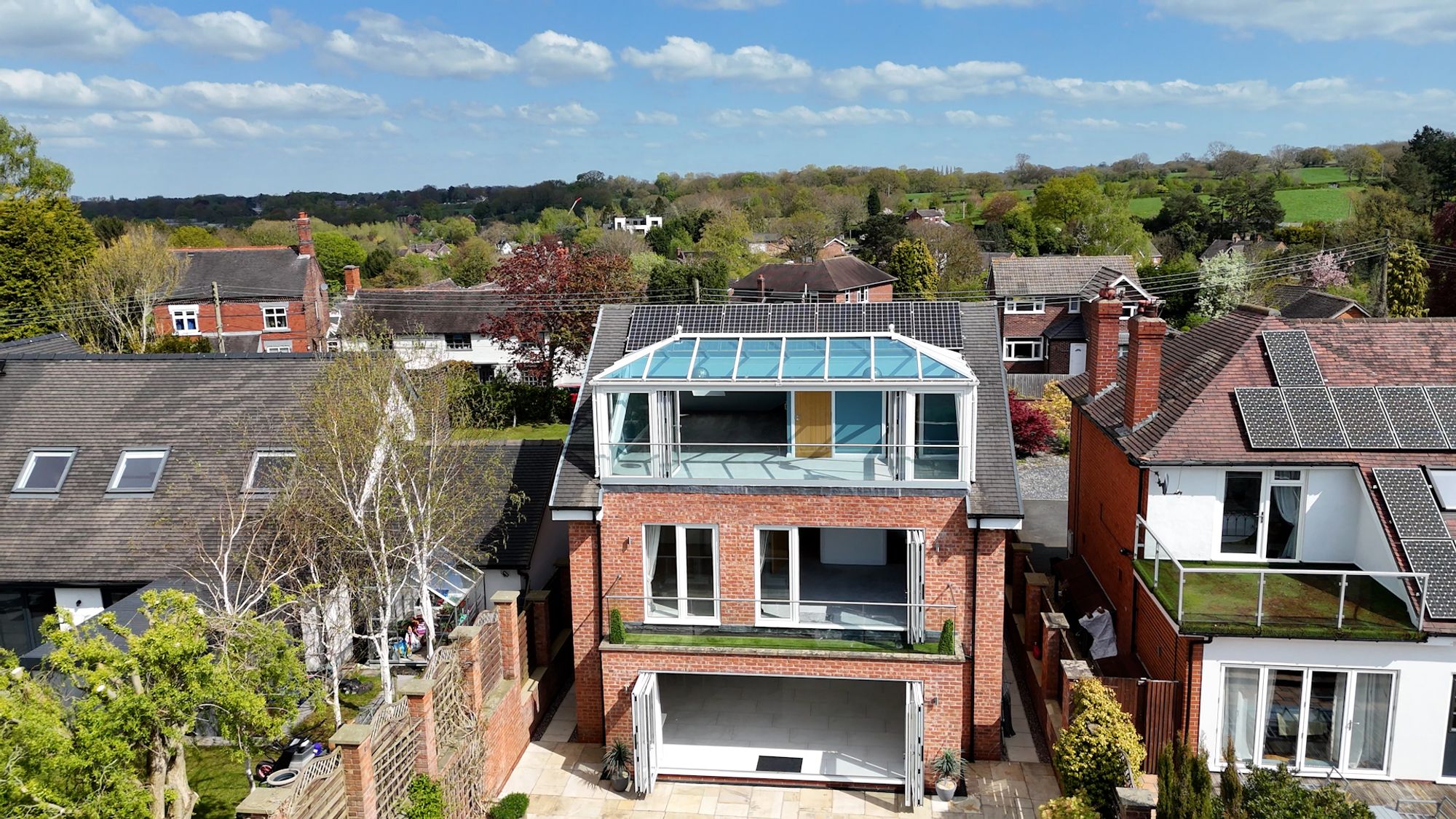 Above the pavilion is a large elevated roof terrace, providing panoramic views across the surrounding fields and rolling Cheshire countryside. This space is perfectly suited for โalfrescoโ dining, entertaining or simply enjoying the surroundings & evening sunsets.