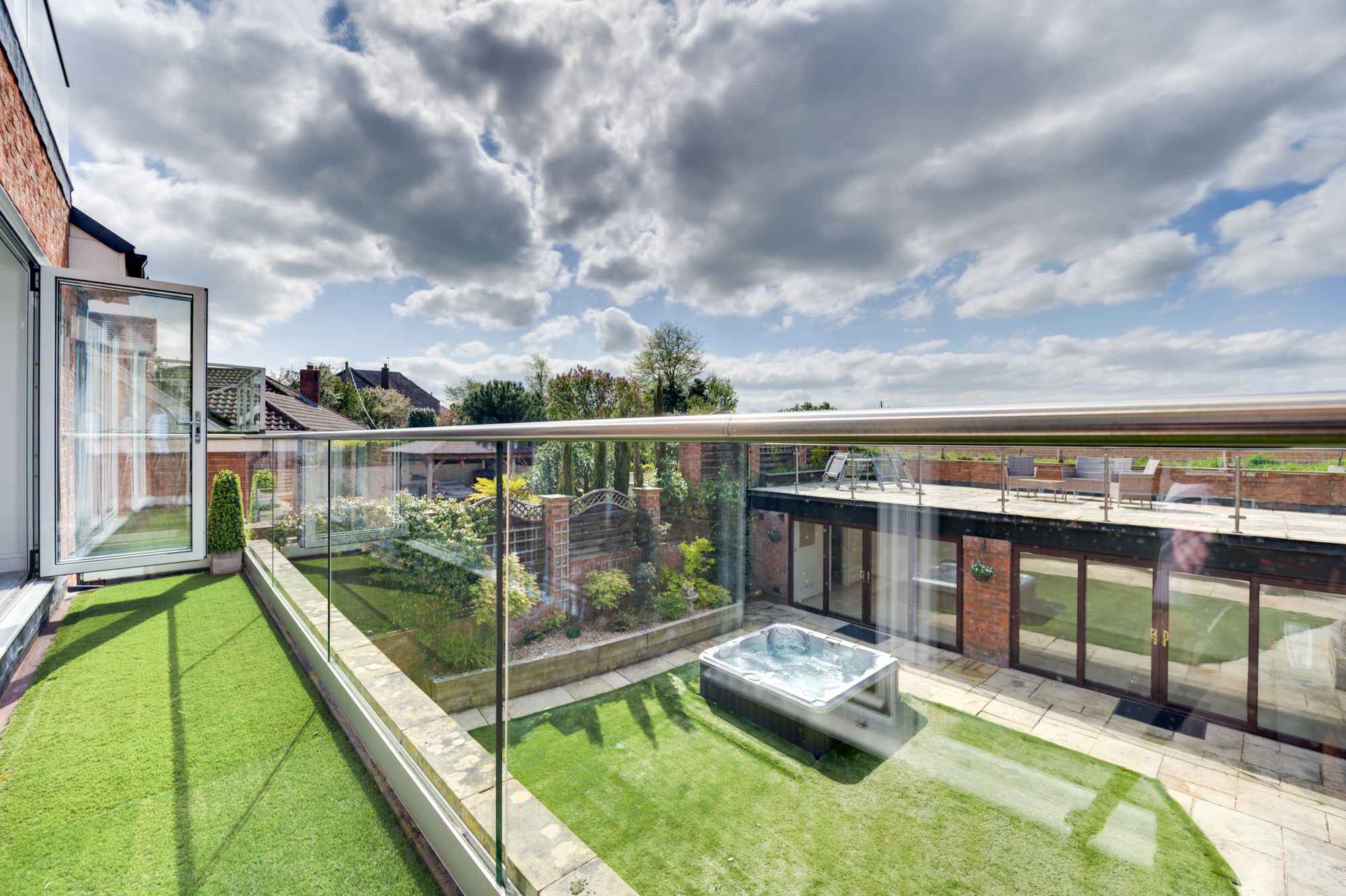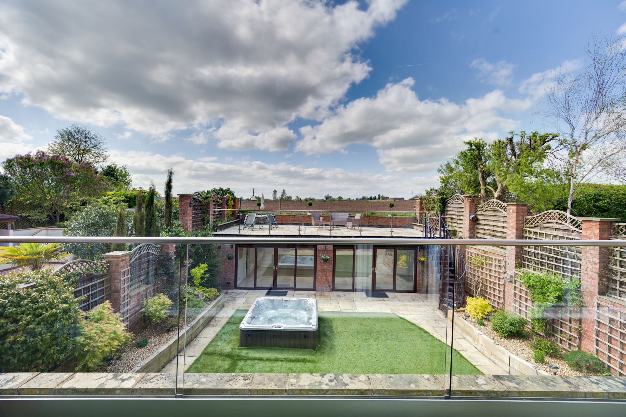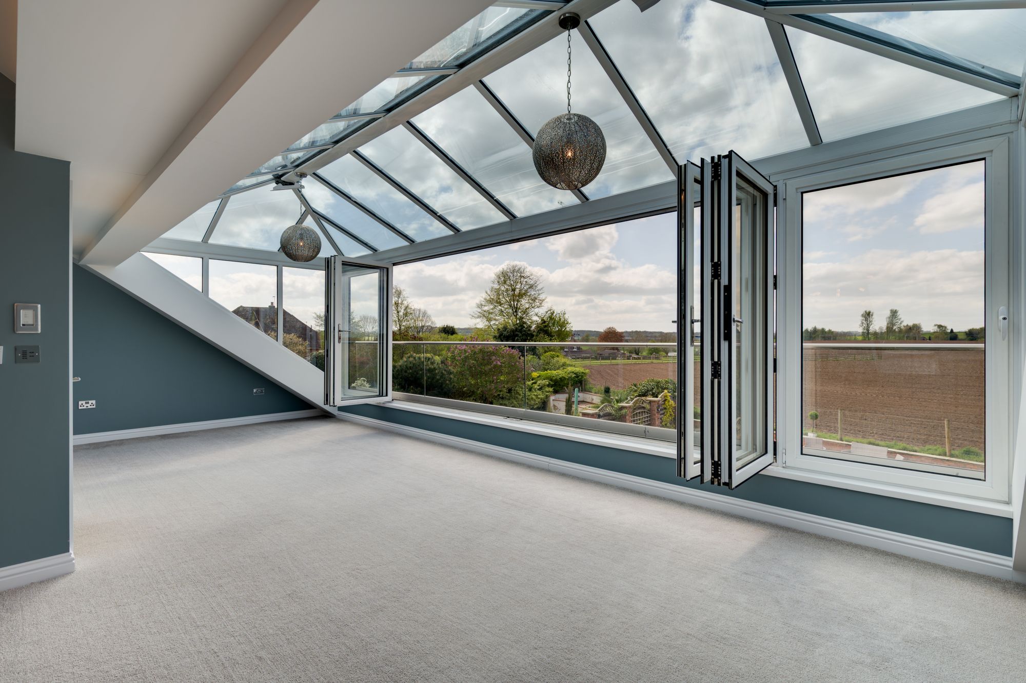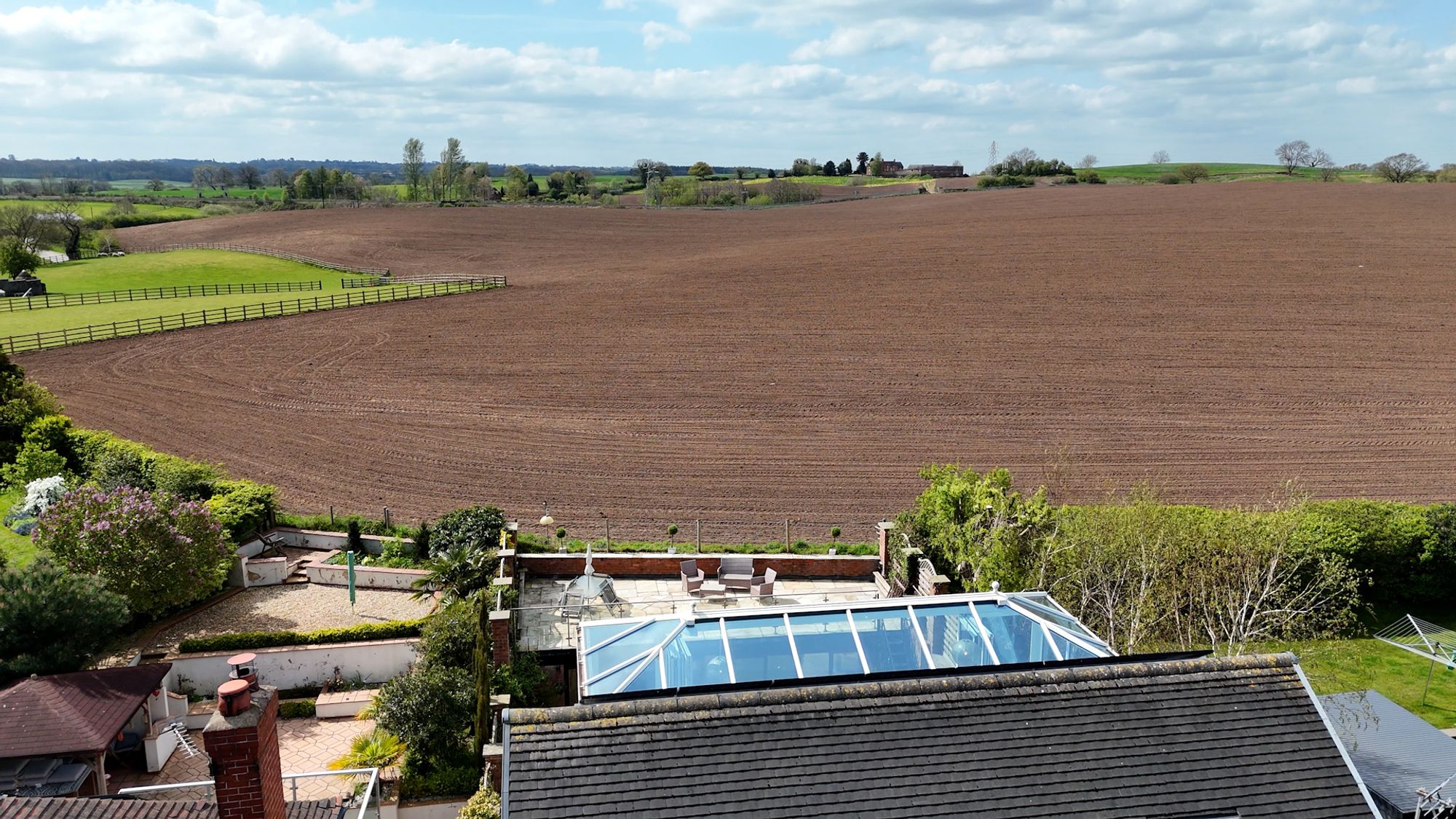 Above the pavilion is a large elevated roof terrace, providing panoramic views across the surrounding fields and rolling Cheshire countryside. This space is perfectly suited for โalfrescoโ dining, entertaining or simply enjoying the surroundings & evening sunsets.