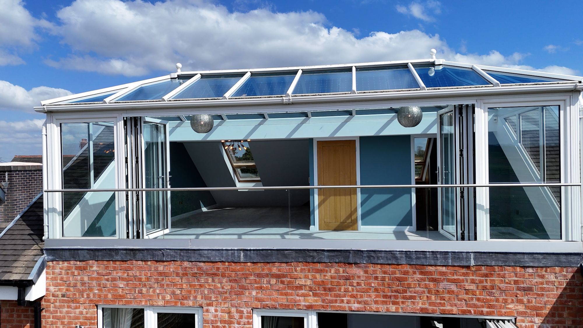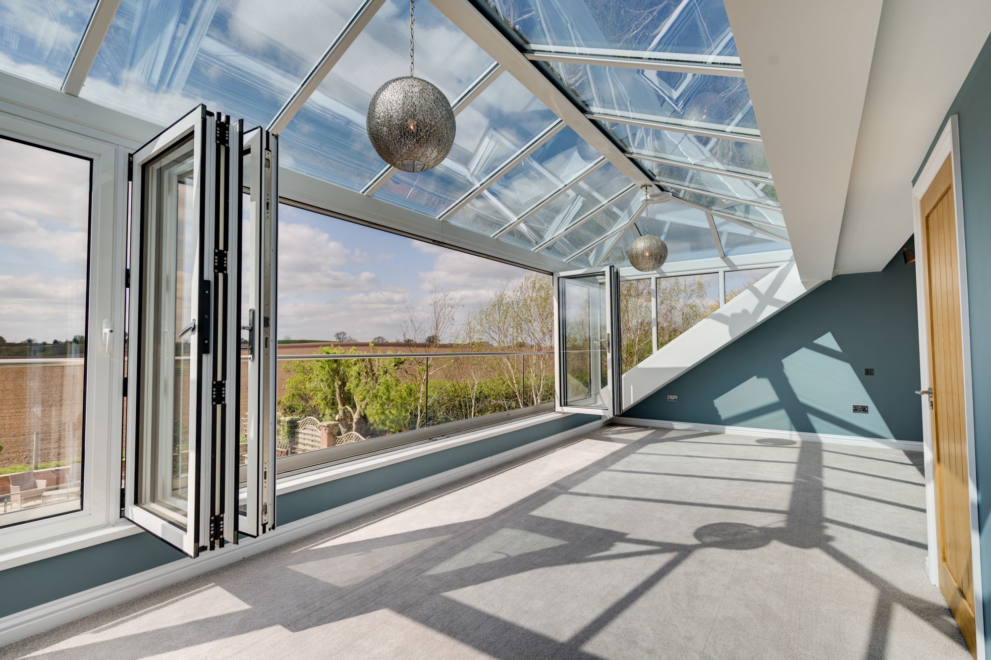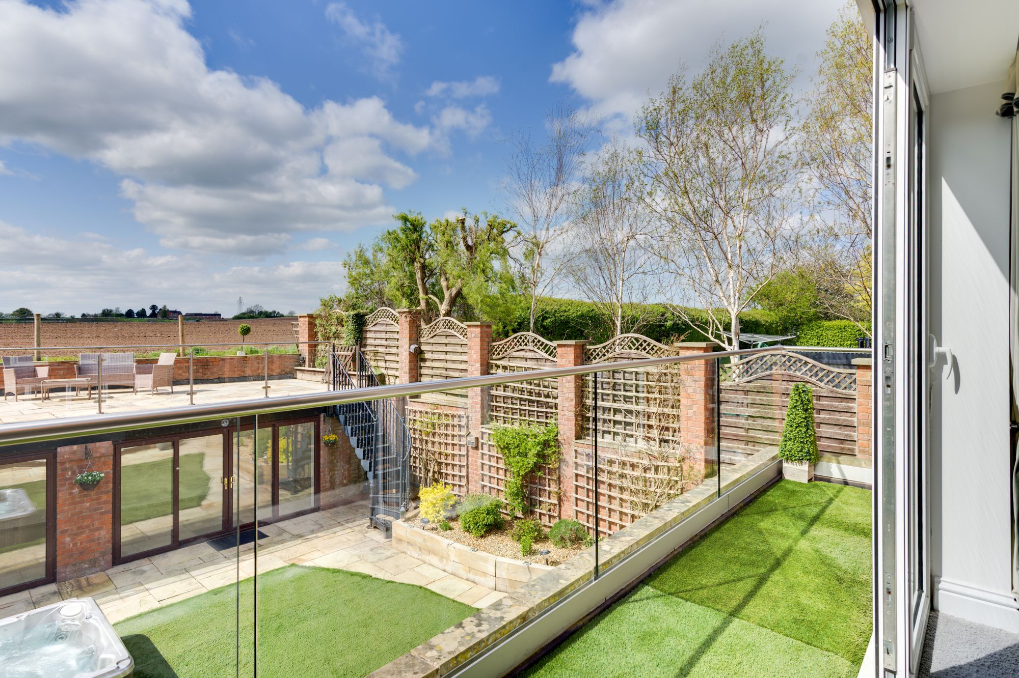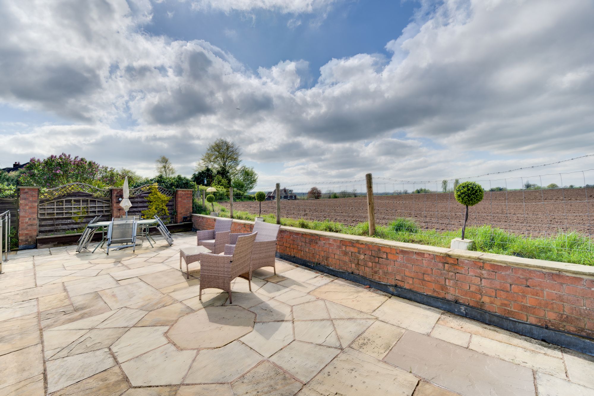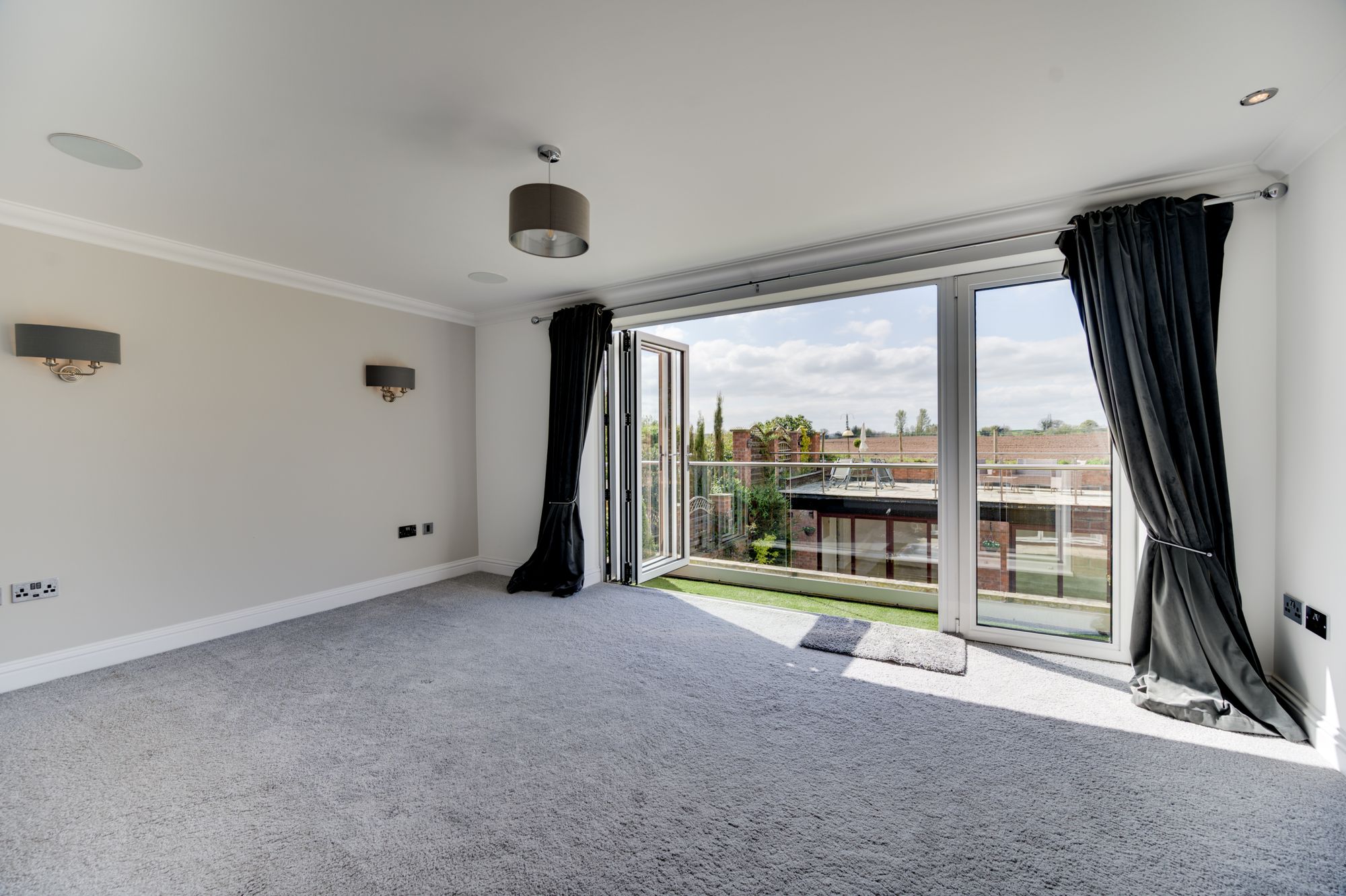 Above the pavilion is a large elevated roof terrace, providing panoramic views across the surrounding fields and rolling Cheshire countryside. This space is perfectly suited for โalfrescoโ dining, entertaining or simply enjoying the surroundings & evening sunsets.