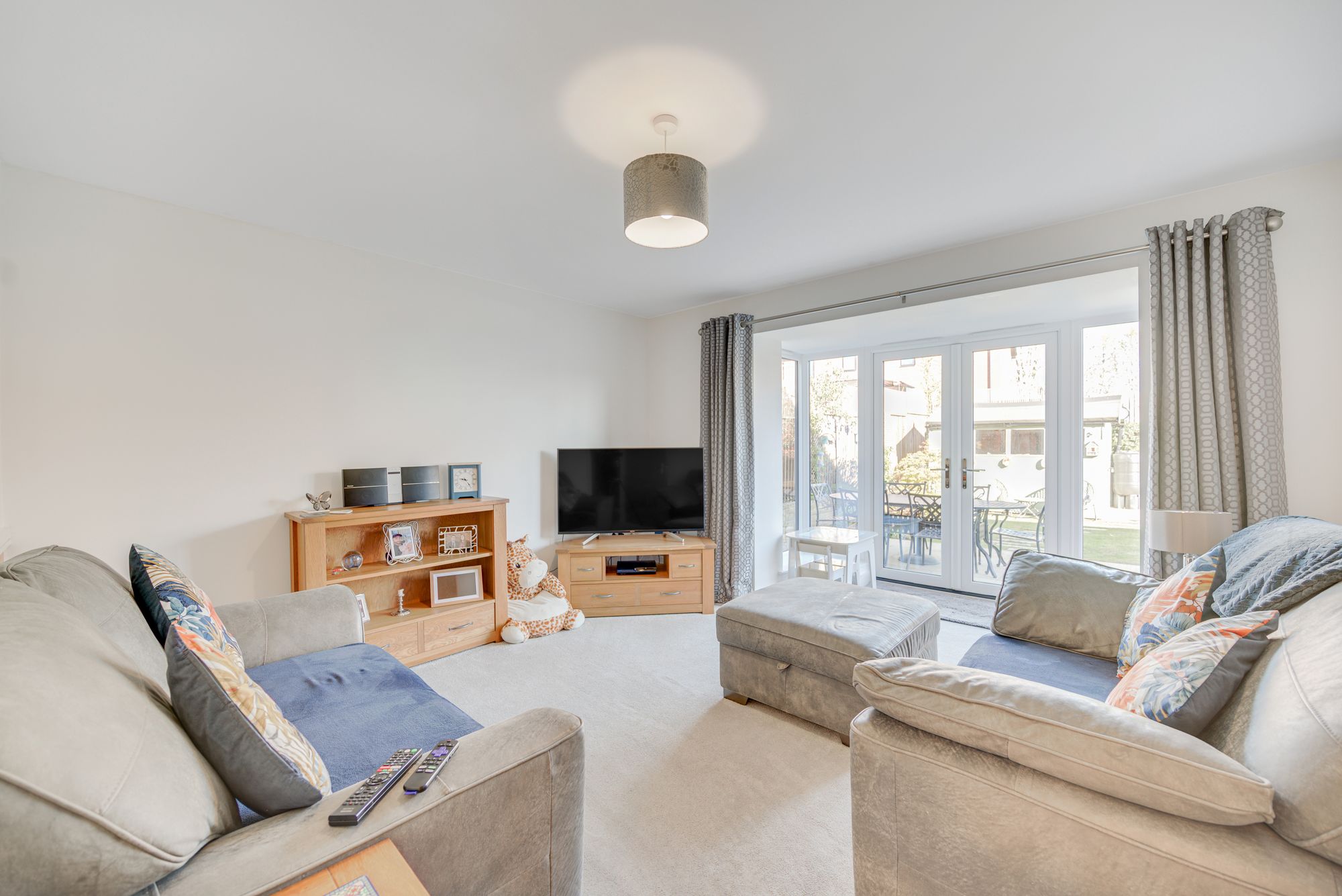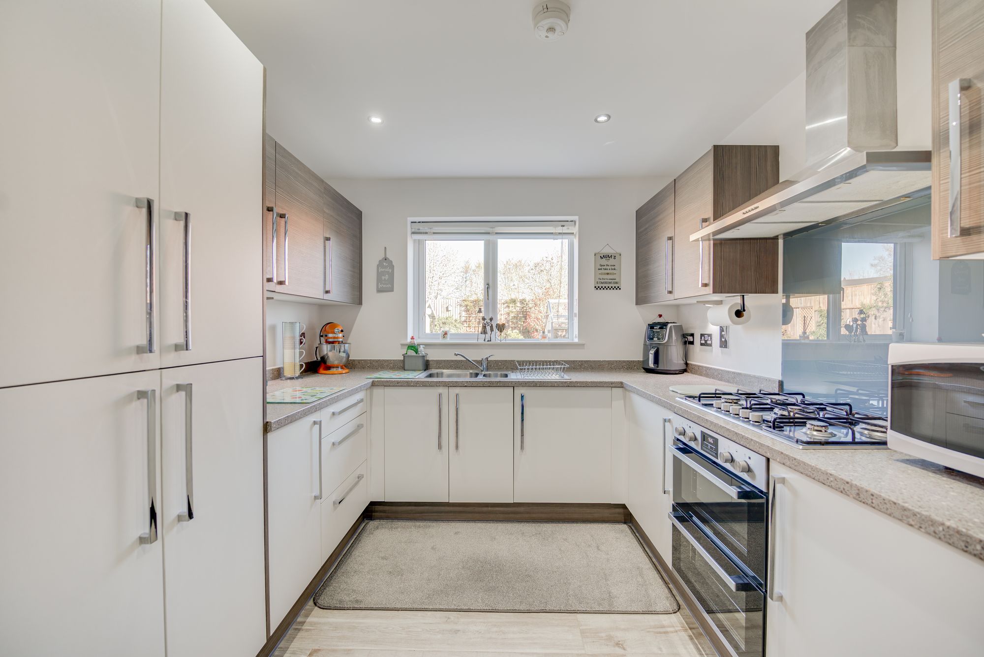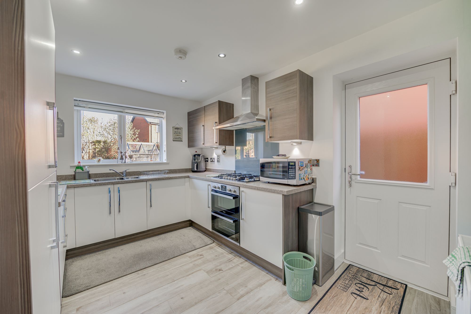 Welcome to this beautifully presented detached house, offering an exceptional blend of modern comfort and versatile living across three spacious bedrooms, two contemporary bathrooms, and two inviting reception rooms. Step through the stylish front door into a welcoming hallway with sleek laminate and wood-effect flooring, setting the tone for the home’s light-filled, neutral decor. The generous living room is a true highlight, featuring French doors that open directly onto the landscaped garden, seamlessly connecting indoor and outdoor spaces and flooding the room with natural light – perfect for both relaxation and entertaining. The heart of the home is a stunning, contemporary kitchen boasting integrated appliances, sleek modern units, a gas hob, and a double oven, with ample natural light creating a bright and inviting atmosphere. Adjacent to the kitchen, a utility room with abundant storage and modern lighting provides practical functionality, while the versatile second reception room – complete with a cosy built-in seating nook and stylish decor – offers flexible space for dining, a home office, or additional lounging.