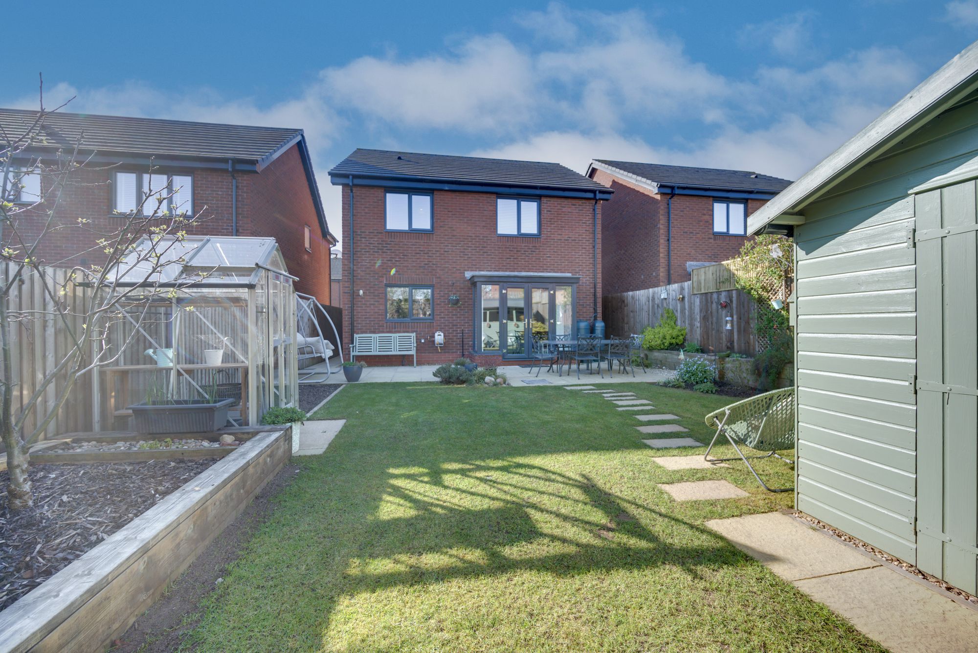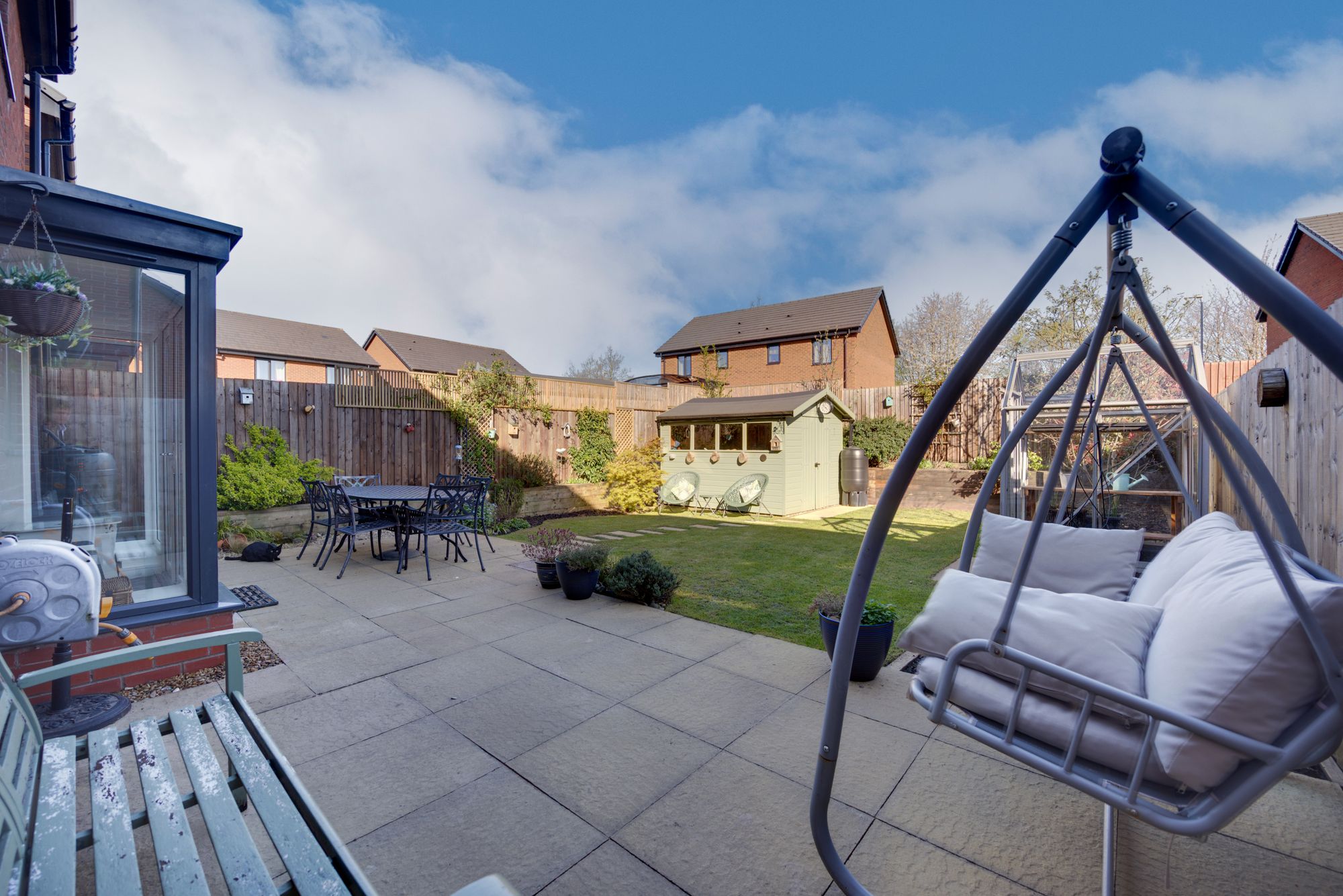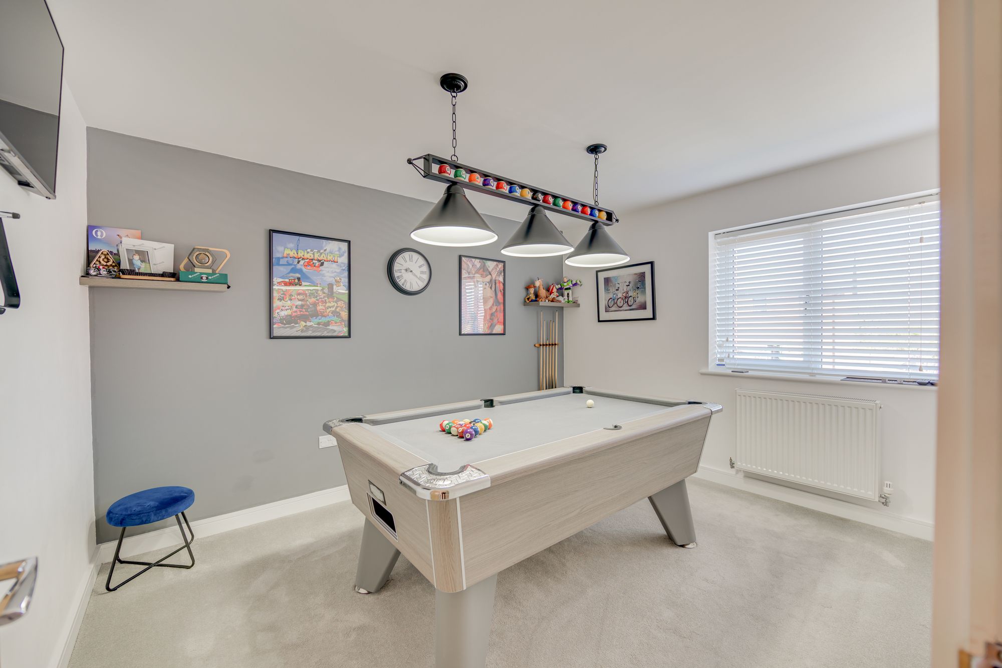 Upstairs, each of the three bedrooms is thoughtfully designed with large windows, modern lighting fixtures, and ample built-in storage, ensuring comfort and style for all family members. The principal bathroom features a luxurious walk-in shower with sleek fixtures and a rainfall showerhead, complemented by a second bathroom with a bath-tub, wall-mounted vanity, and heated towel rail – both spaces enhanced by natural light and elegant tiling. The propertyโs recreational room adds a unique touch, boasting a contemporary billiards table, decorative shelving, and adjustable lighting for leisure and entertainment. Outside, the expansive rear garden is a true sanctuary, offering a spacious patio for al fresco dining, a well-maintained lawn, a charming swing seat, and a greenhouse for gardening enthusiasts. The integral garage and paved driveway provide ample off-road parking, while the attractive front garden enhances kerb appeal with manicured shrubs and a small tree.