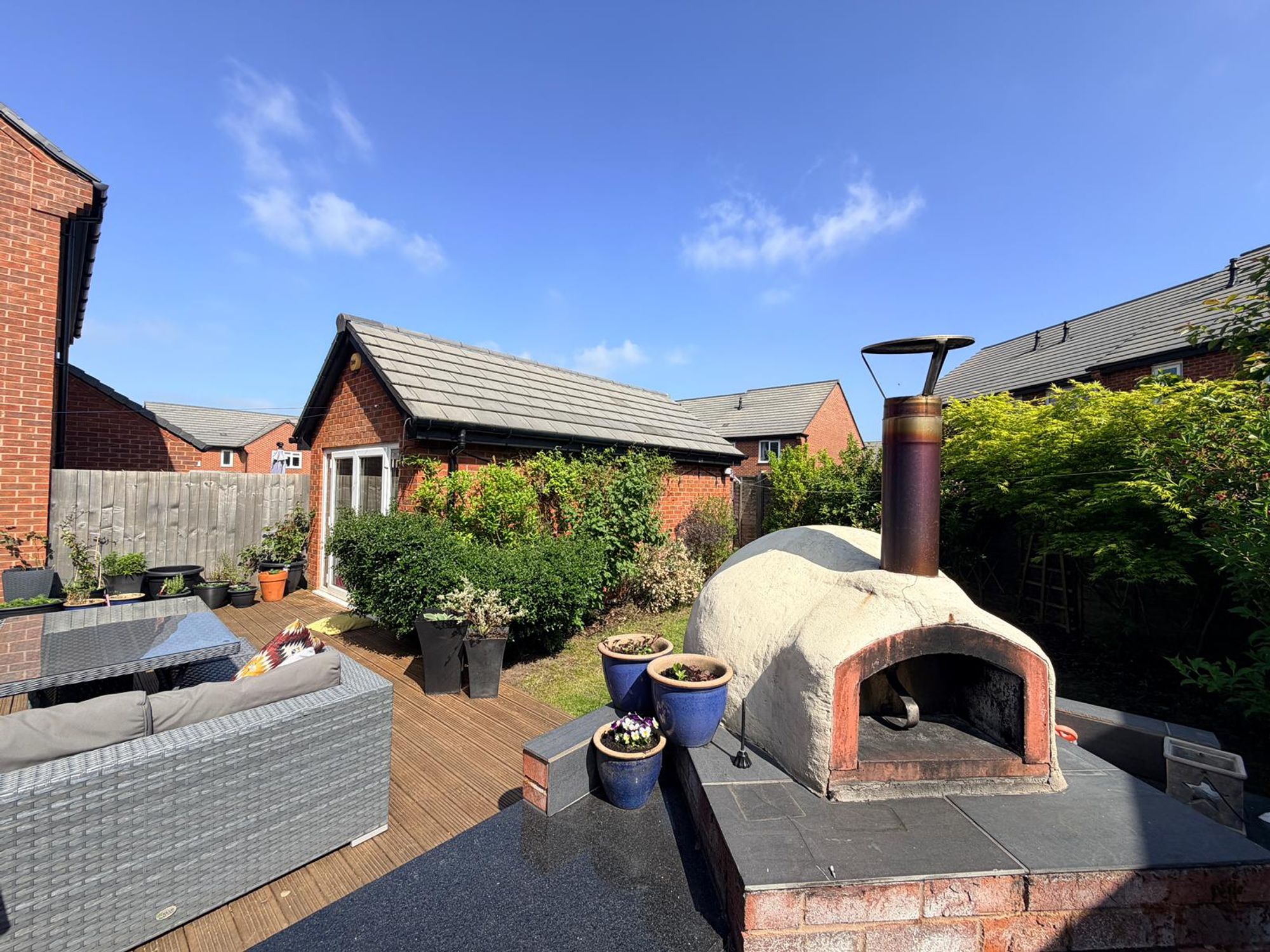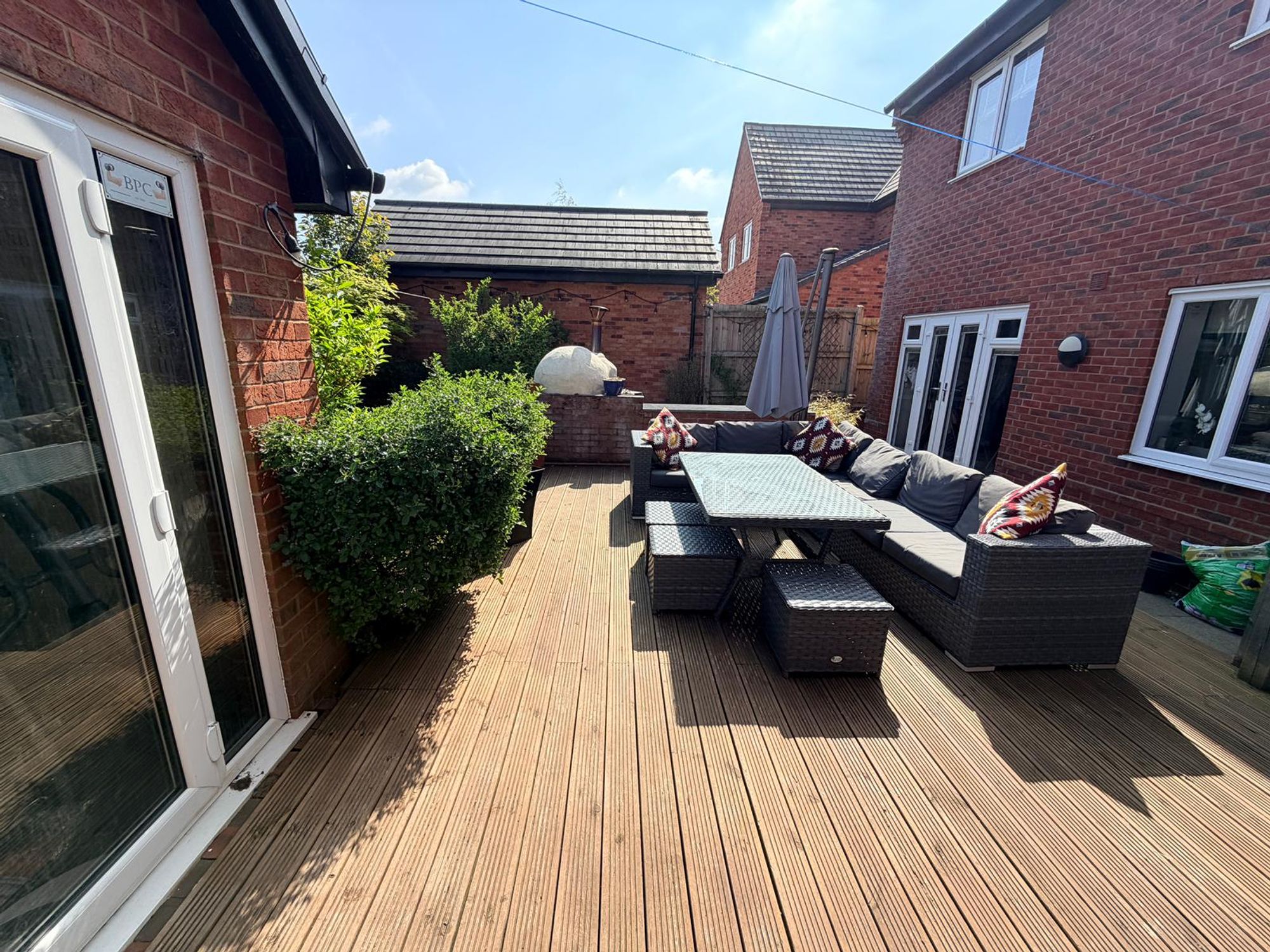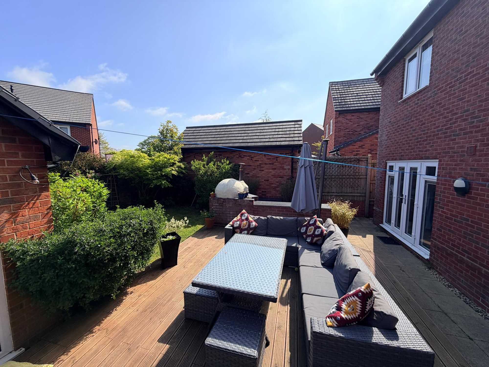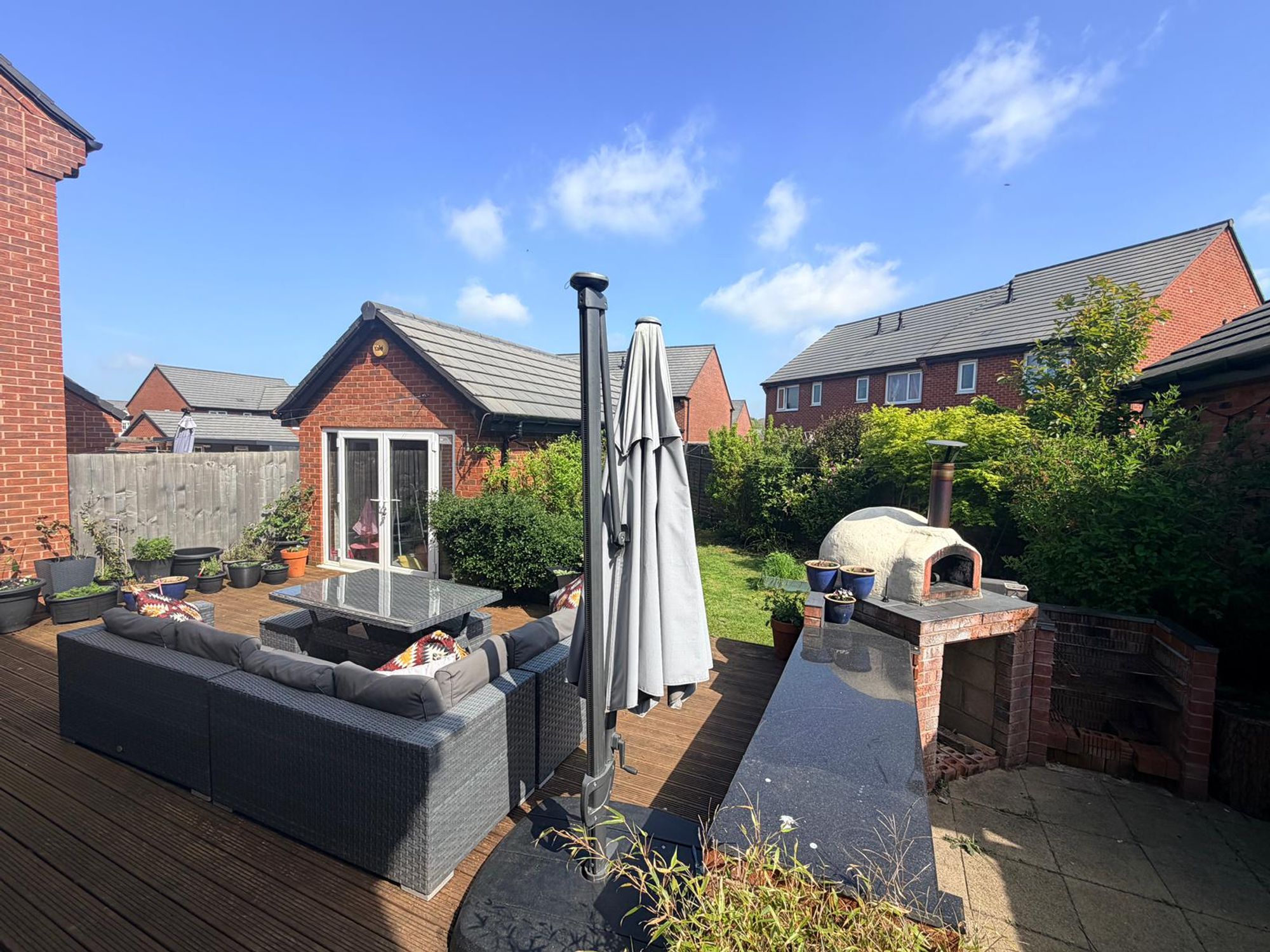 Set on a generous plot, the outdoor space is a standout feature. The rear garden includes a lawned area, a large timber decked entertaining terrace, and a stunning outdoor kitchen with stone worktops and pizza oven โ perfect for hosting friends and family. A substantial garage, currently used as a home gym with glazed French doors, offers excellent versatility for a variety of uses (subject to planning).