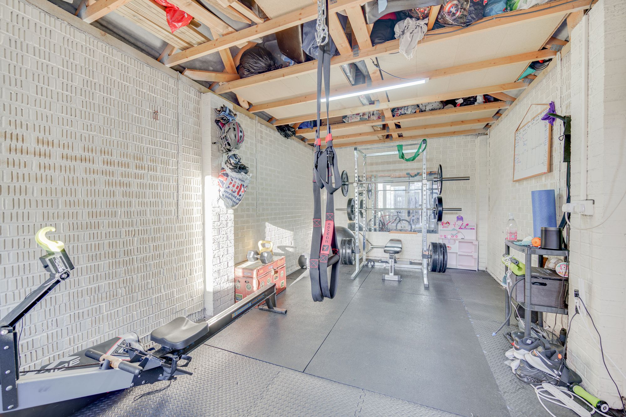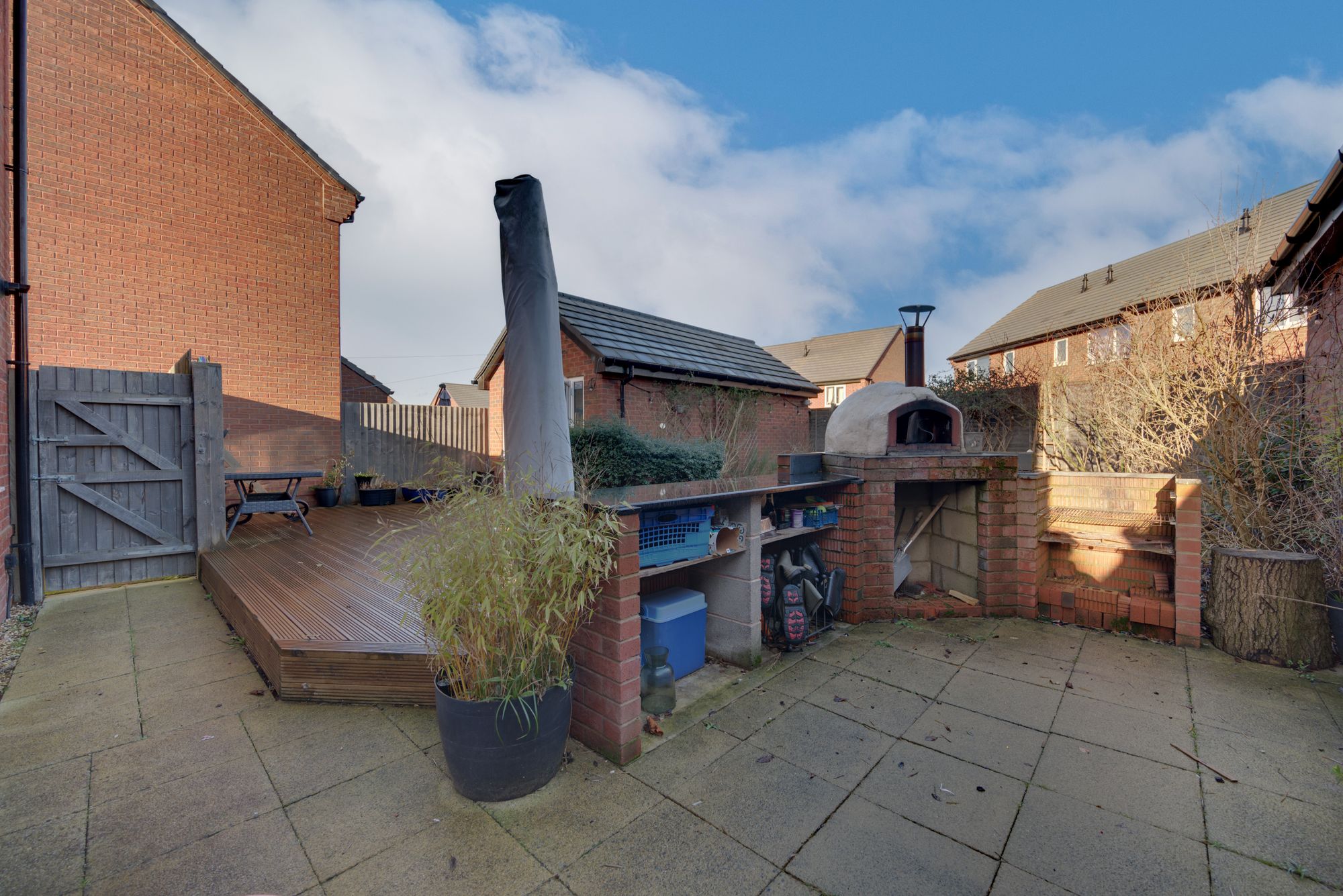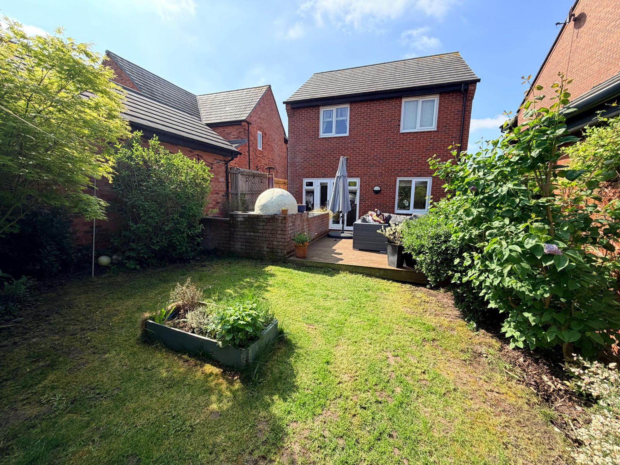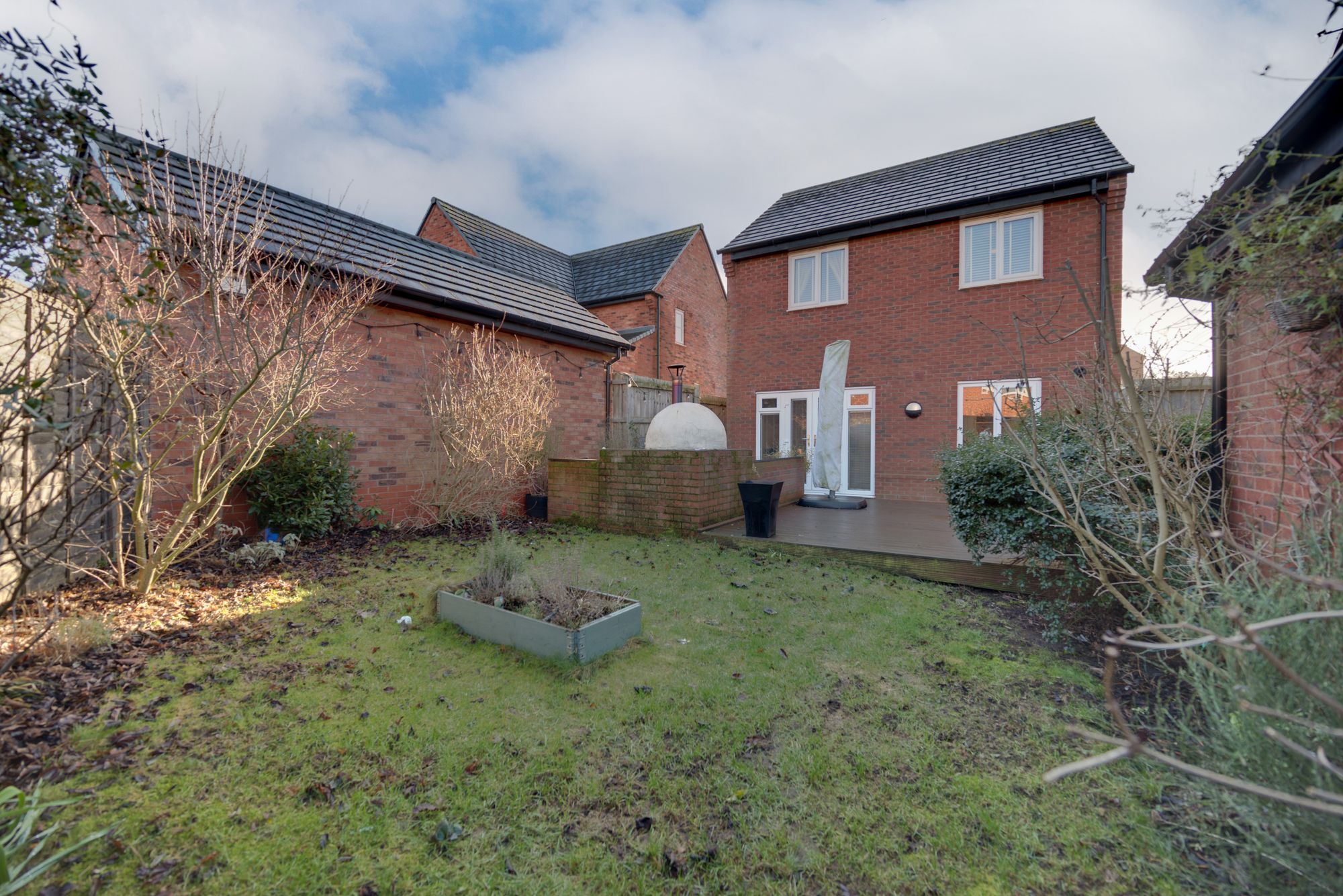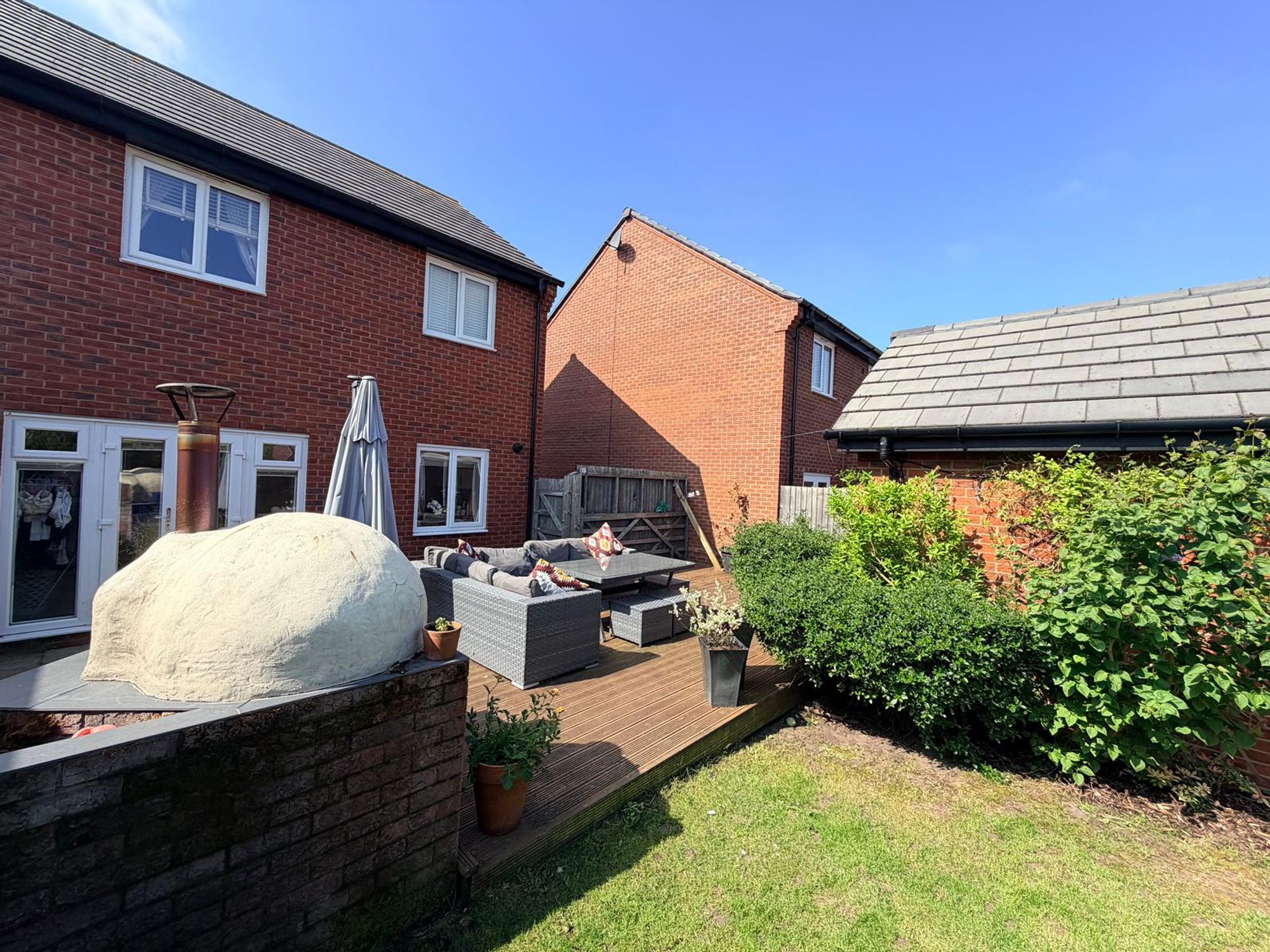 Set on a generous plot, the outdoor space is a standout feature. The rear garden includes a lawned area, a large timber decked entertaining terrace, and a stunning outdoor kitchen with stone worktops and pizza oven โ perfect for hosting friends and family. A substantial garage, currently used as a home gym with glazed French doors, offers excellent versatility for a variety of uses (subject to planning).