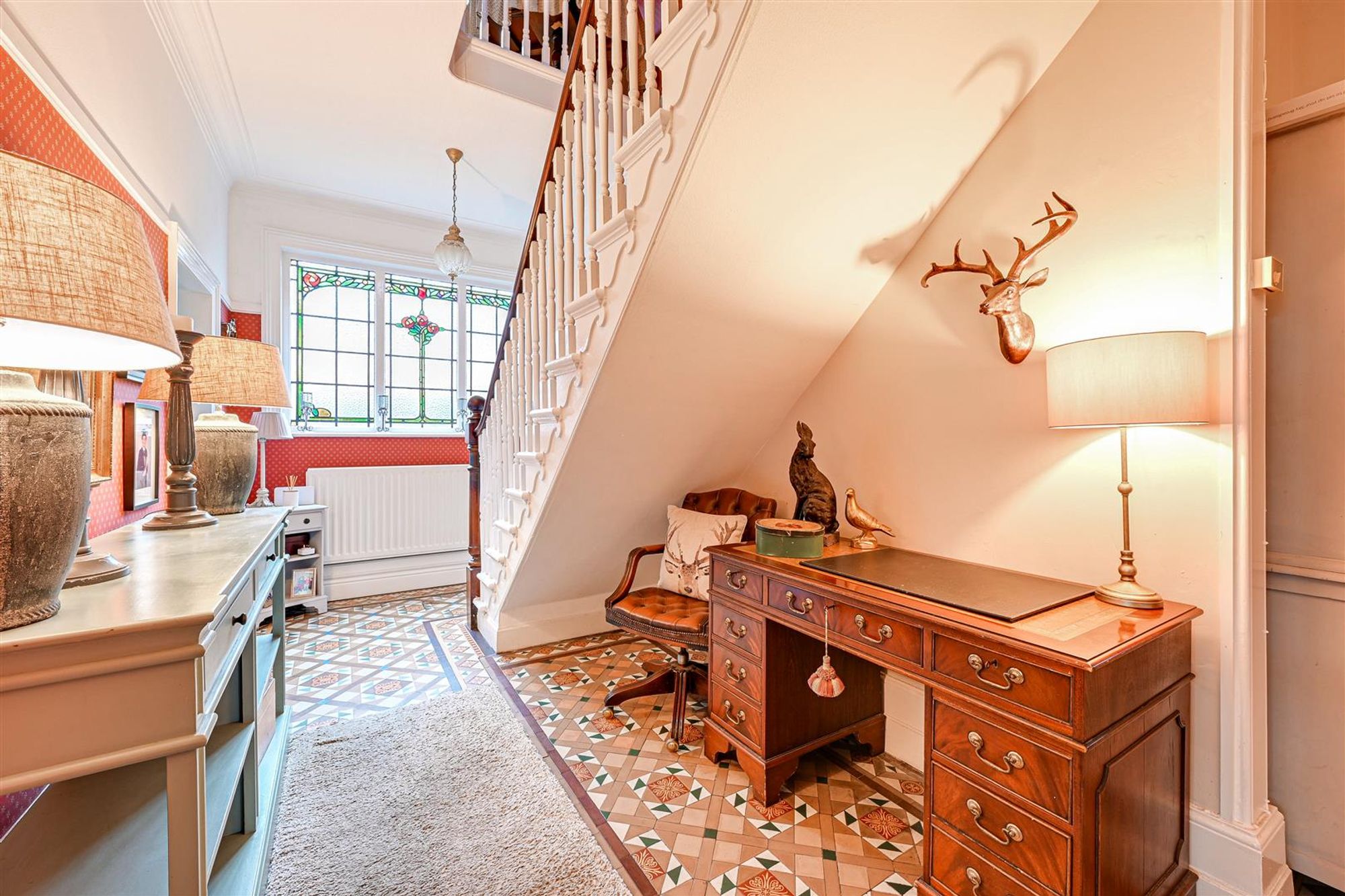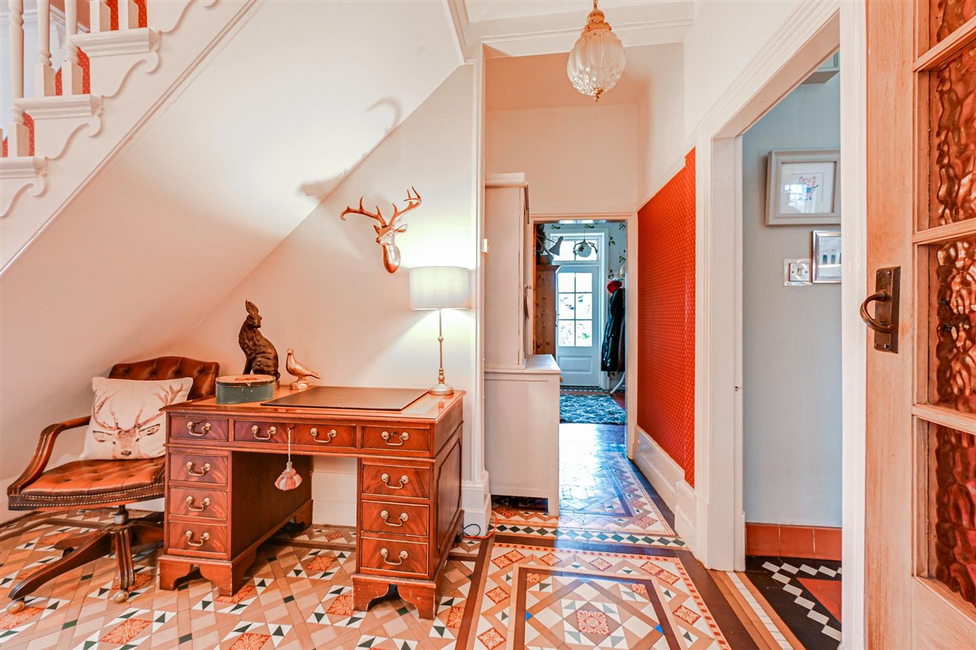 Dimensions: 5.49m x 2.44m (18'0 x 8'0). Original coving to ceiling. Picture rail. Fabulous staired and leaded glass feature window. 13 Amp power points. Attractive Minton tiled floor. Double panel central heating radiator. BT telephone point (Subject to BT approval). Wide shallow rise staircase with spindled balustrade and mahogany hand rail.