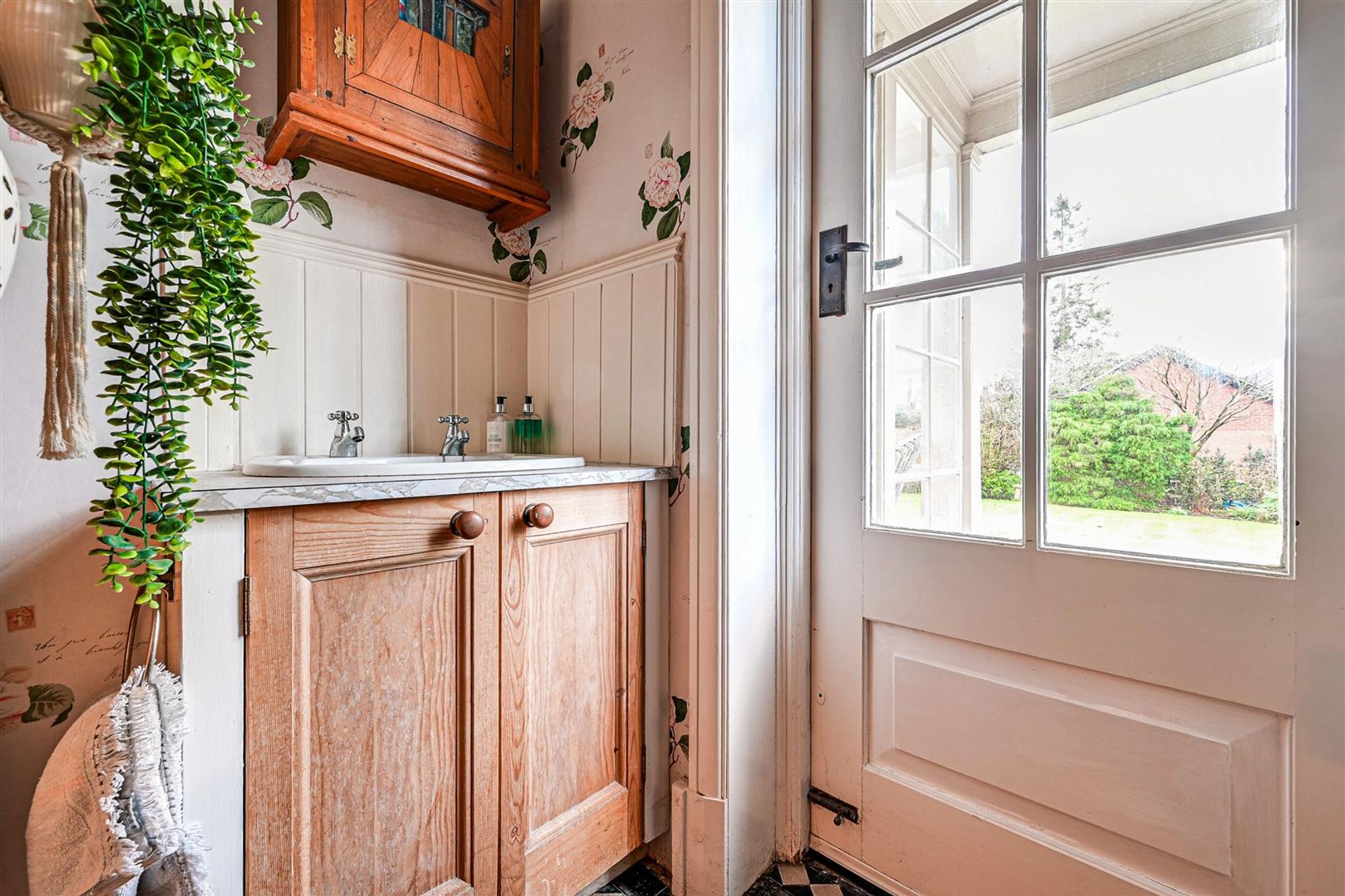 Original pine fronted cupboard. Wash hand basin set in vanity unit with cupboard below. Quarry tiled floor. Panelled and glazed door to outside.