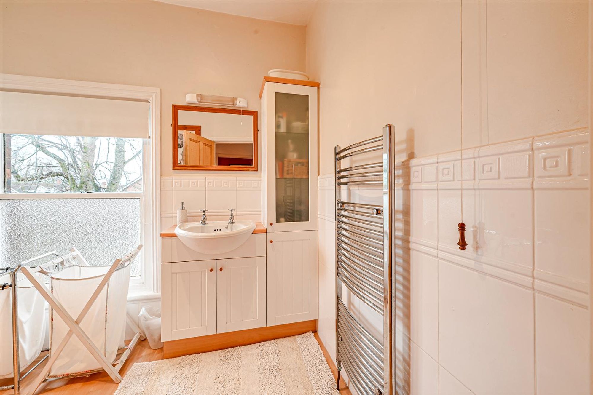 Dimensions: 3.61m x 2.24m (11'10 x 7'4). Timber framed sash window to front aspect. Low voltage downlighters inset. Modern white suite comprising: Wash hand basin set in vanity unit with cupboard below. Panelled bath with chrome telephone handset bath/shower mixer. Enclosed double sized shower cubicle housing a mains fed shower with glass sliding doors. Chrome centrally heated towel radiator. Glazed white tiles to half height.