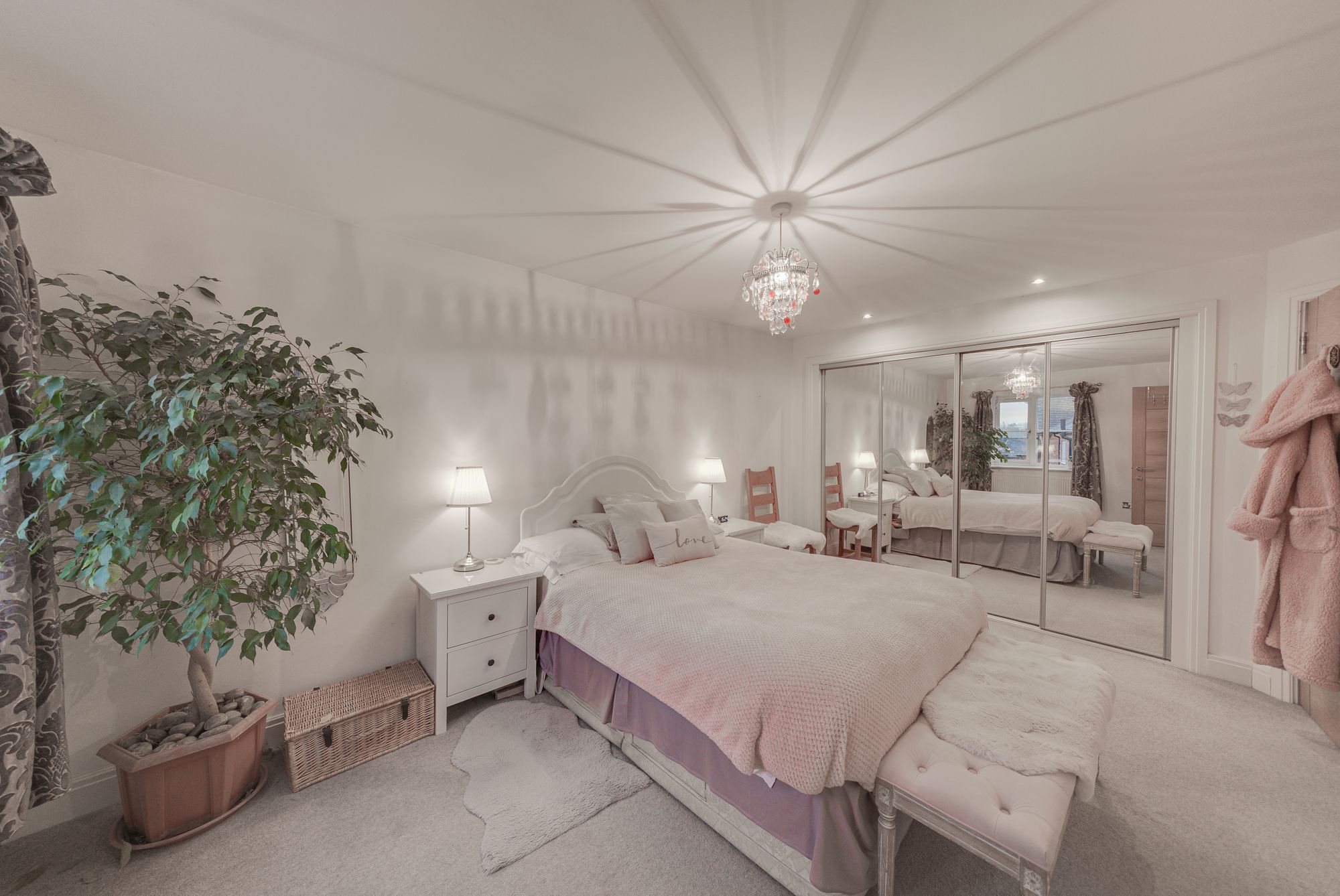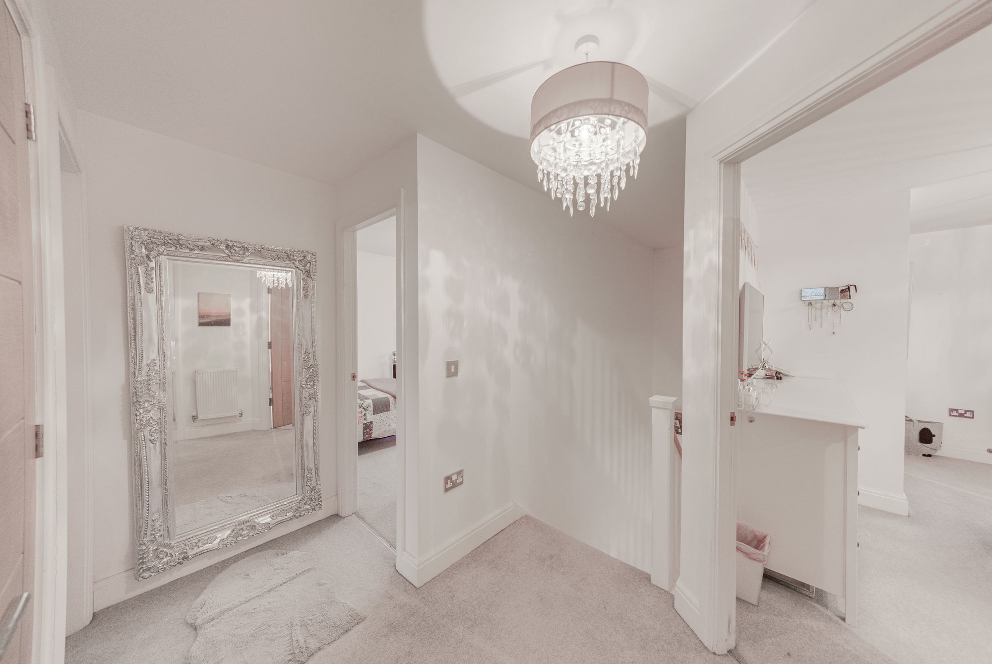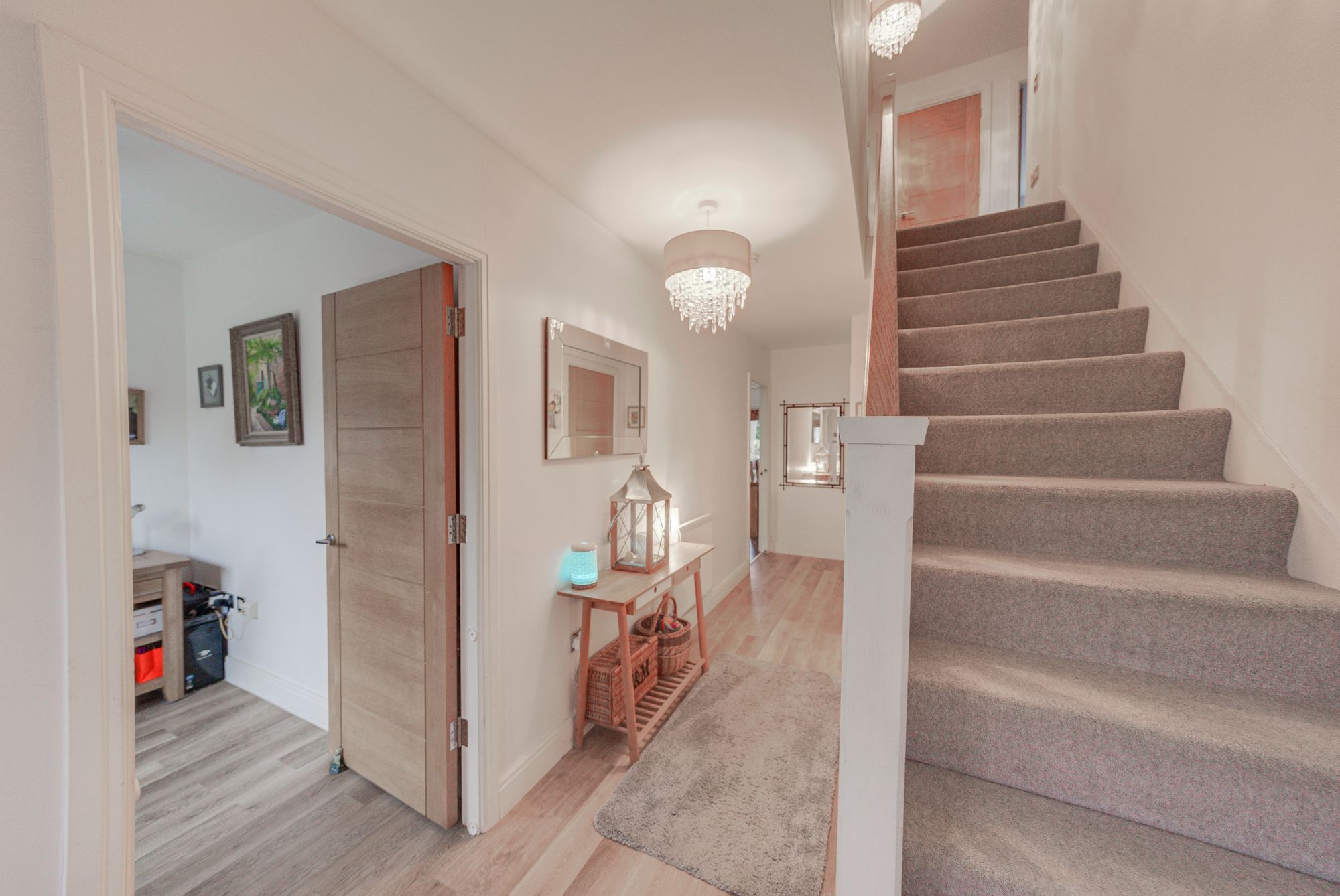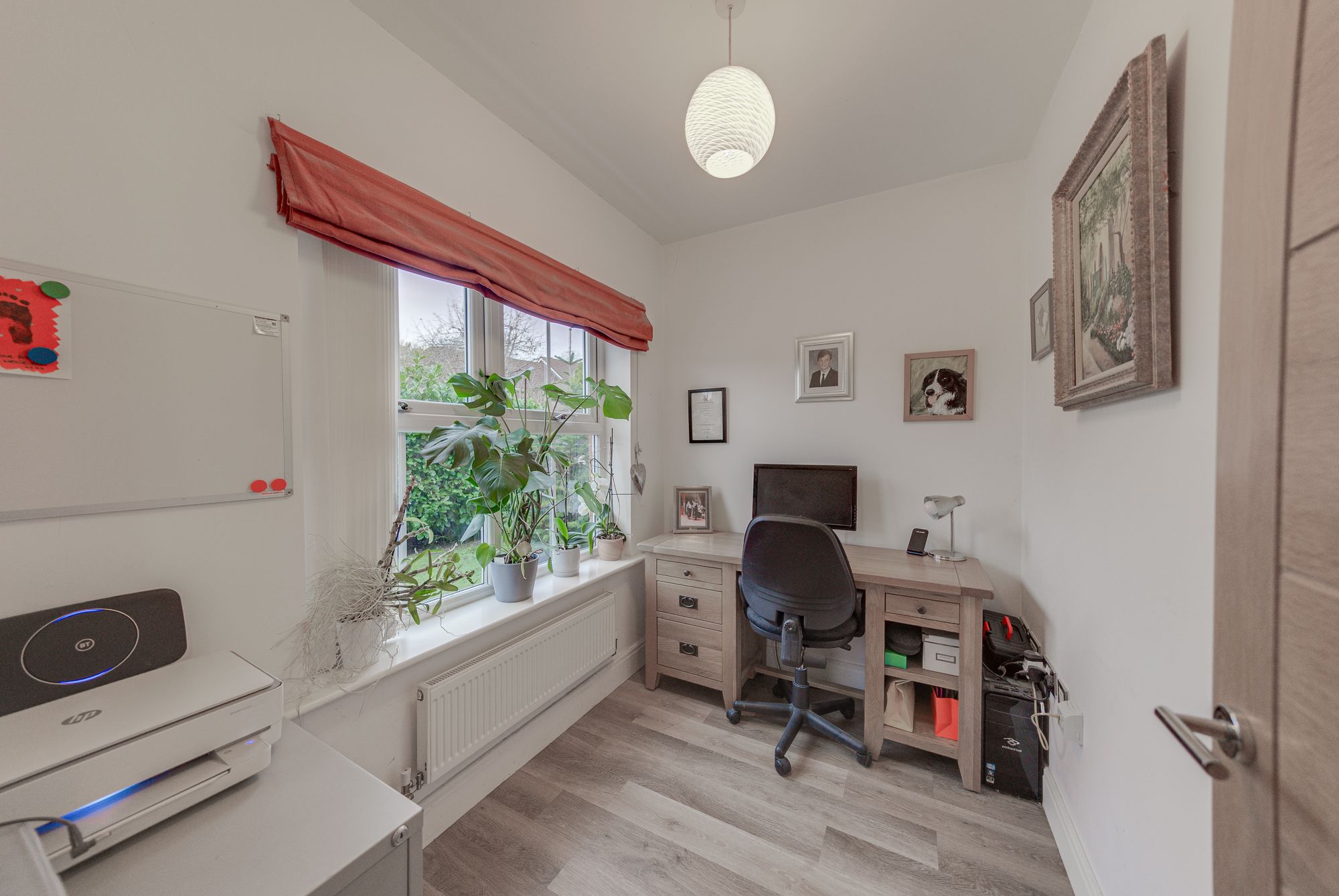 The first floor provides four well-balanced double bedrooms, ensuring generous accommodation for every member of the household. The principal bedroom benefits from wall-to-wall fitted wardrobes and a contemporary en-suite shower room, while a spacious family bathroom and attractive landing complete the upper level.