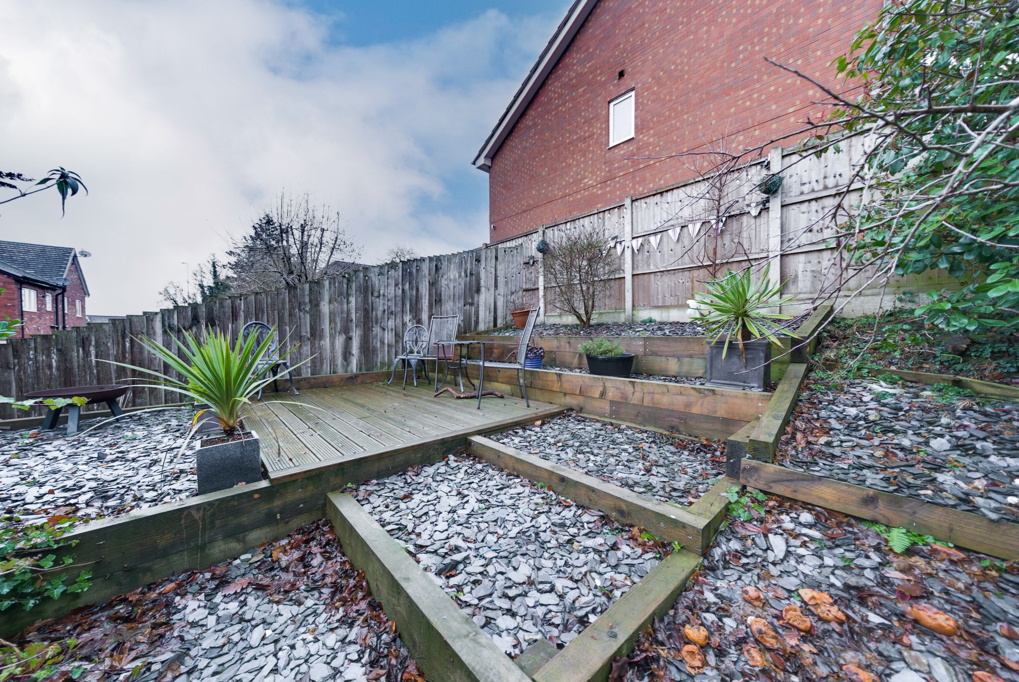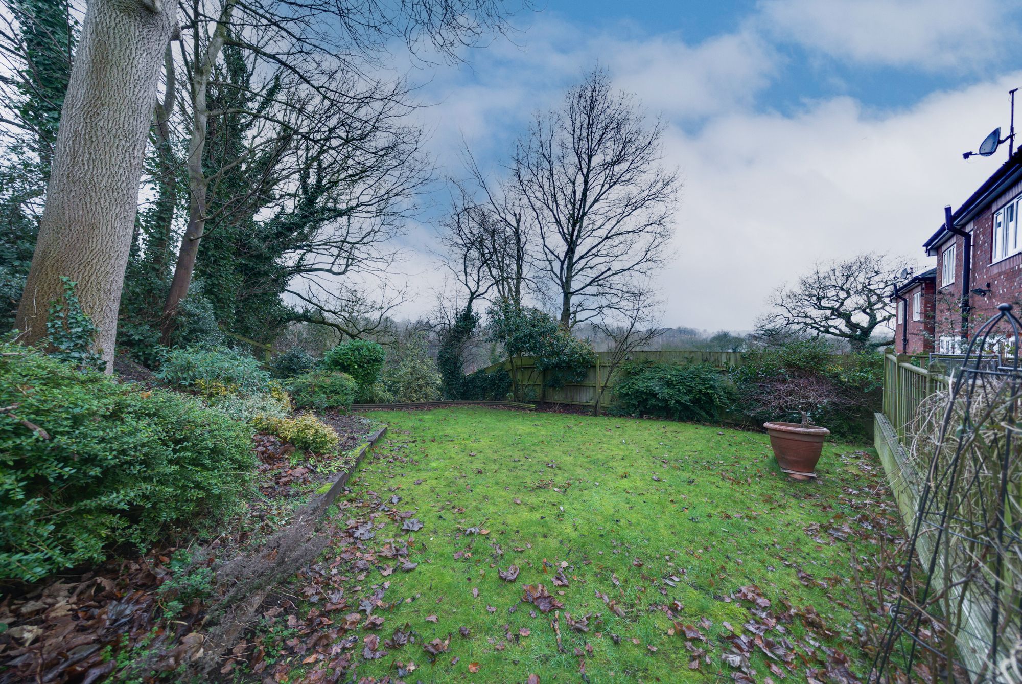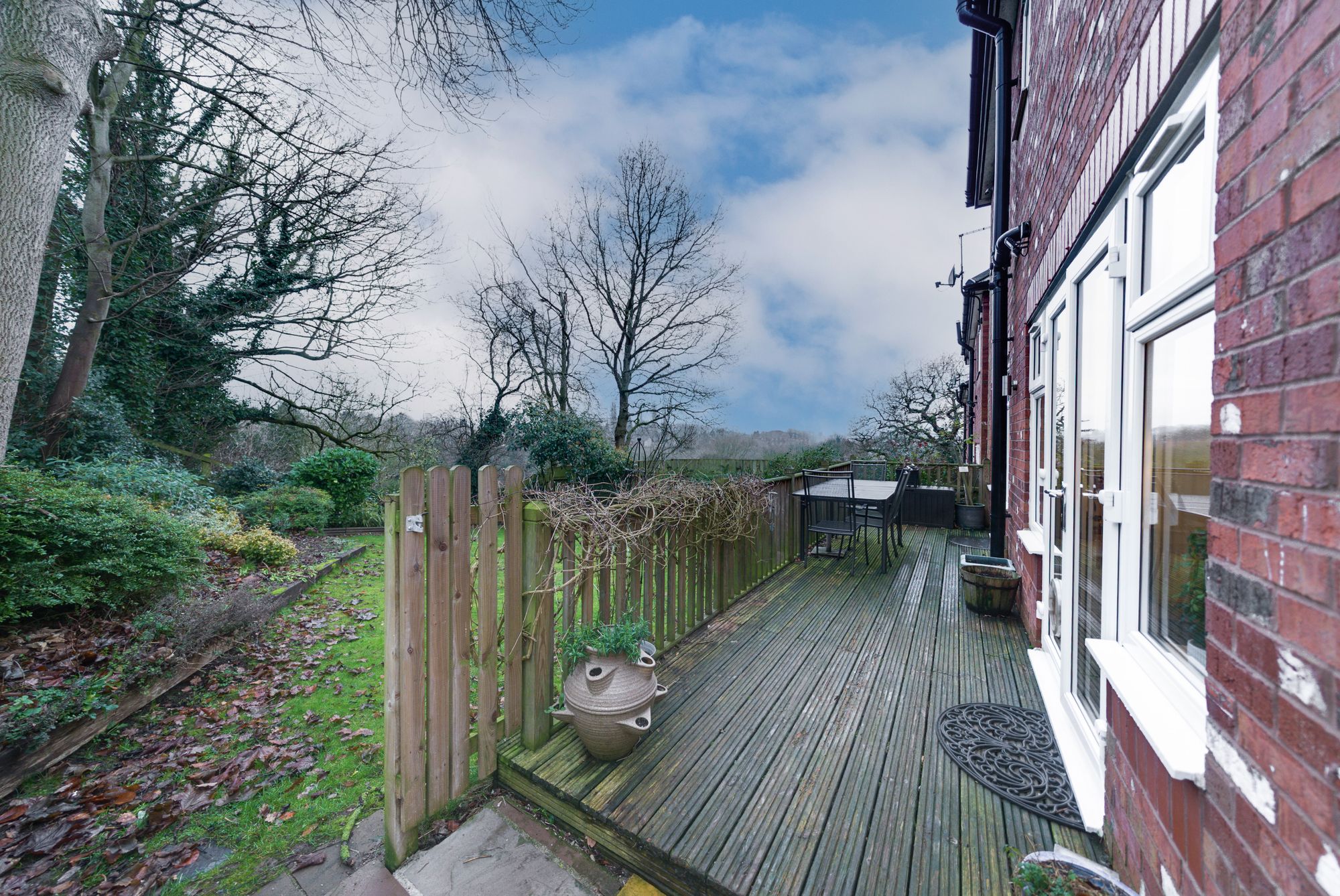 - Rear garden with lawn, woodland backdrop, and full-width decked dining terrace