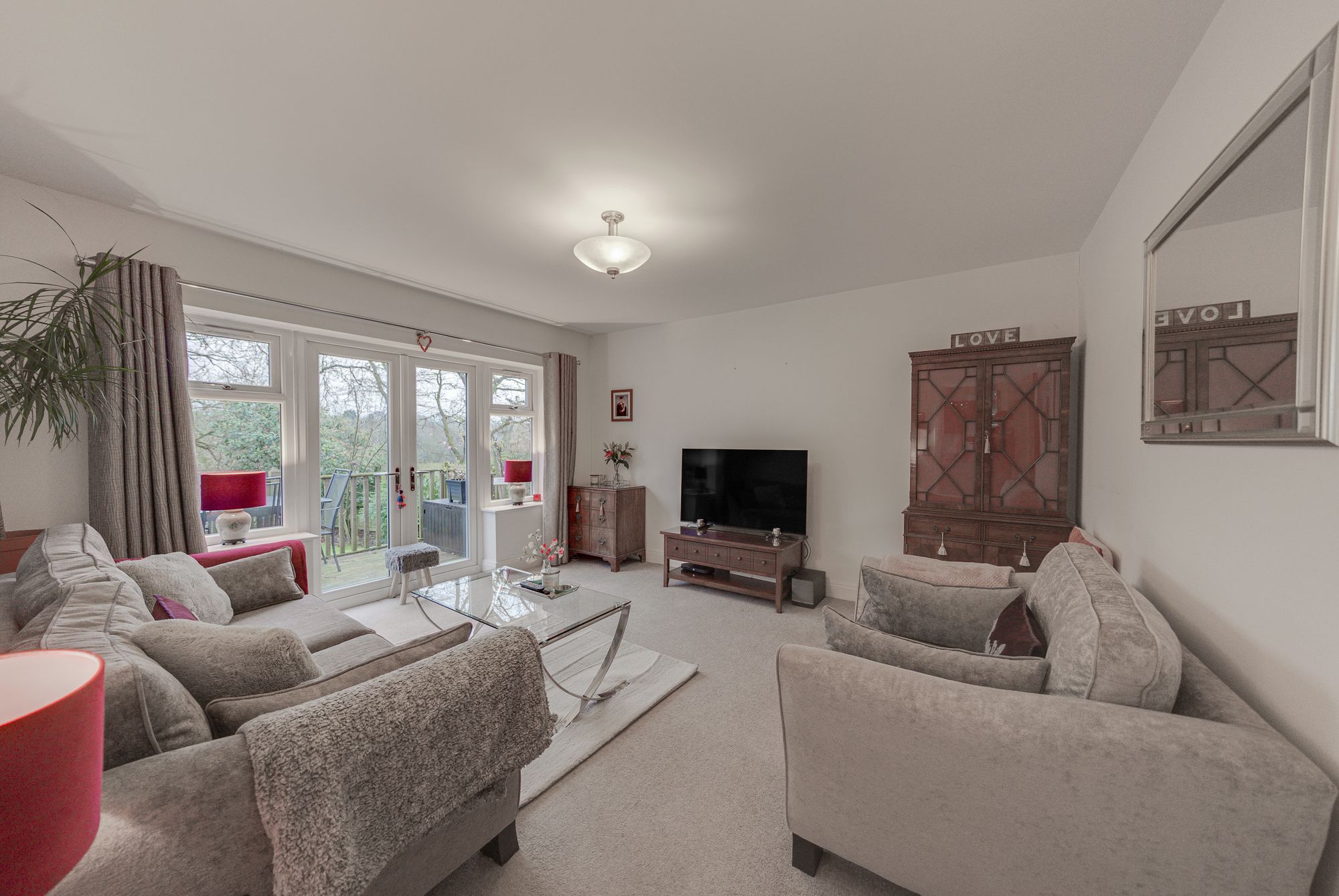 Enjoying gardens to three sides and uninterrupted woodland views to the rear, the property features a lawned garden, a wooded backdrop, and a full-width timber decked dining terrace, perfectly designed to maximise enjoyment of its peaceful setting. An extended block-paved driveway, integral garage with electric roller door, and striking kerb appeal with stone-effect sills, attractive brickwork, and a date stone complete the impressive exterior.