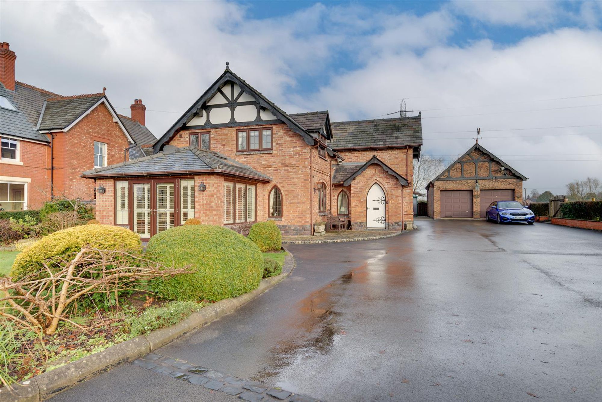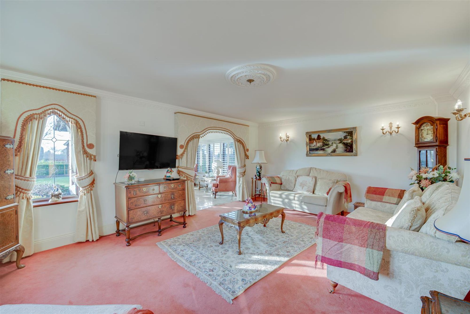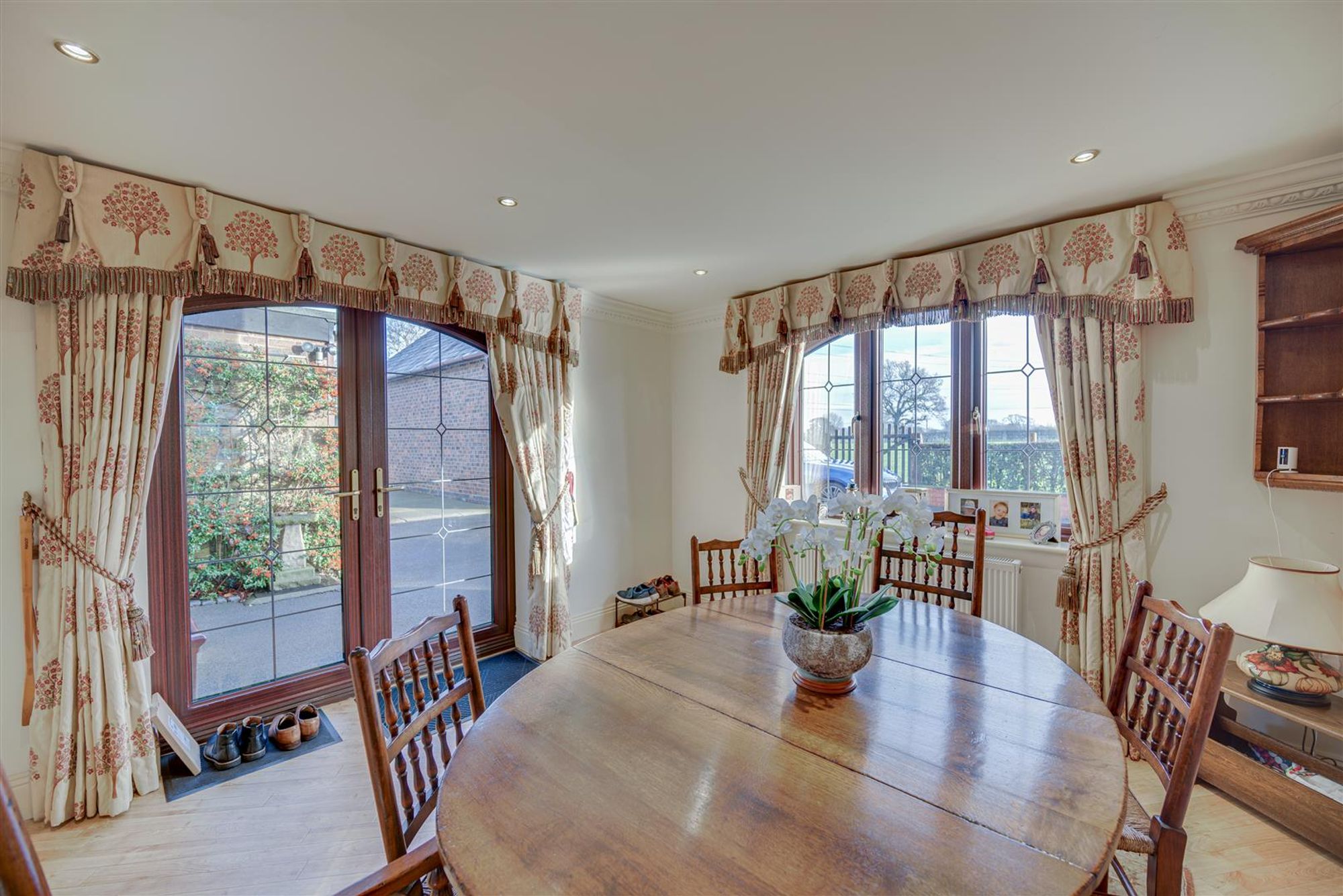 Accompanying the home are a number of features to note, some of which include: A gothic archway & entrance door, a large reception hall with wall panelling, feature glazing & hidden understairs cloaks/study, a ground floor WC, a breakfast kitchen with Corian working surfaces & 'aga' style cooker plus separate utility & formal dining room with French doors. The lounge is generous with dual aspect windows and provides access to a garden room extension having French doors, bespoke shutters and polished travertine style floor tiles with underfloor heating.