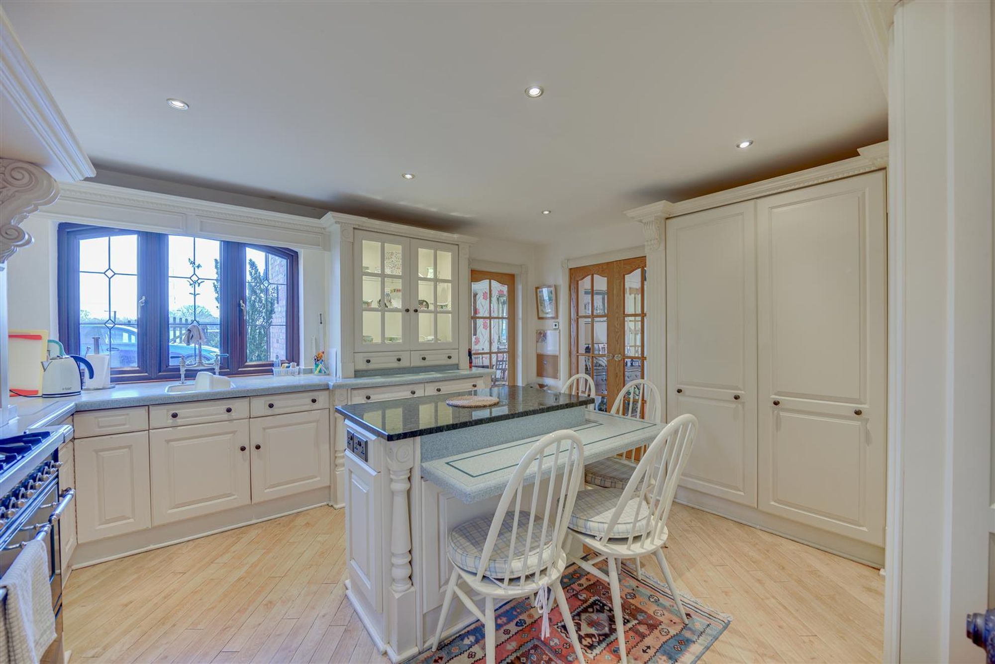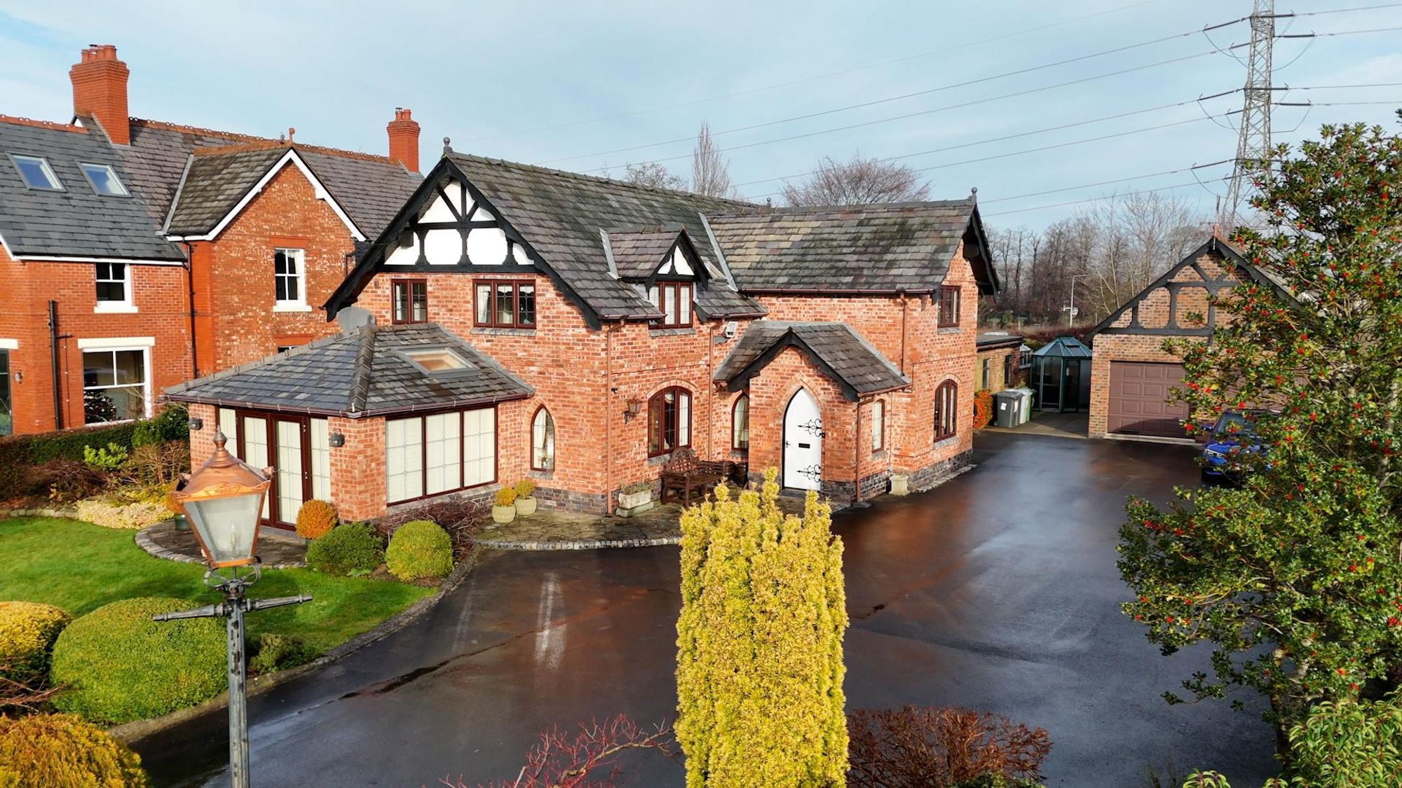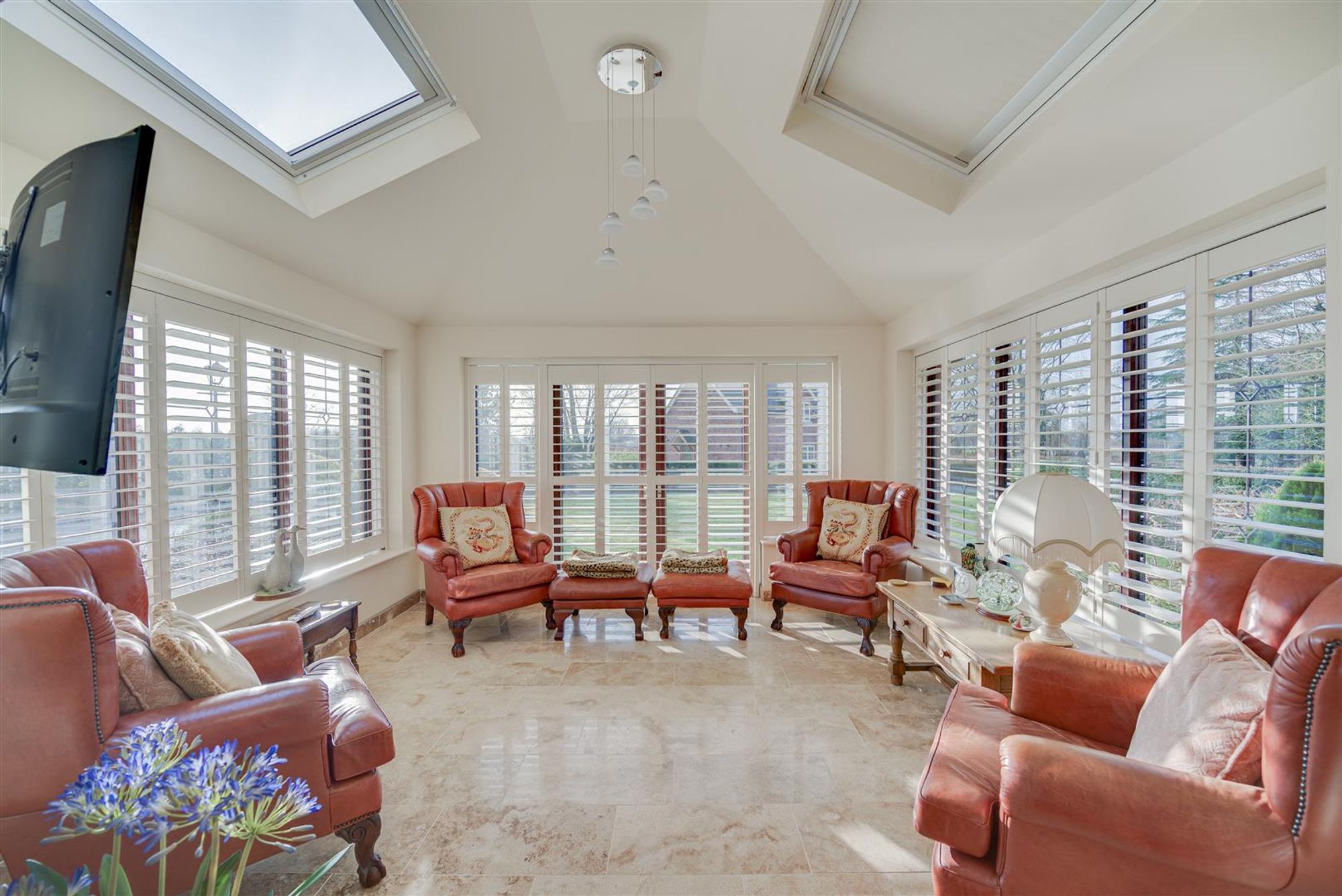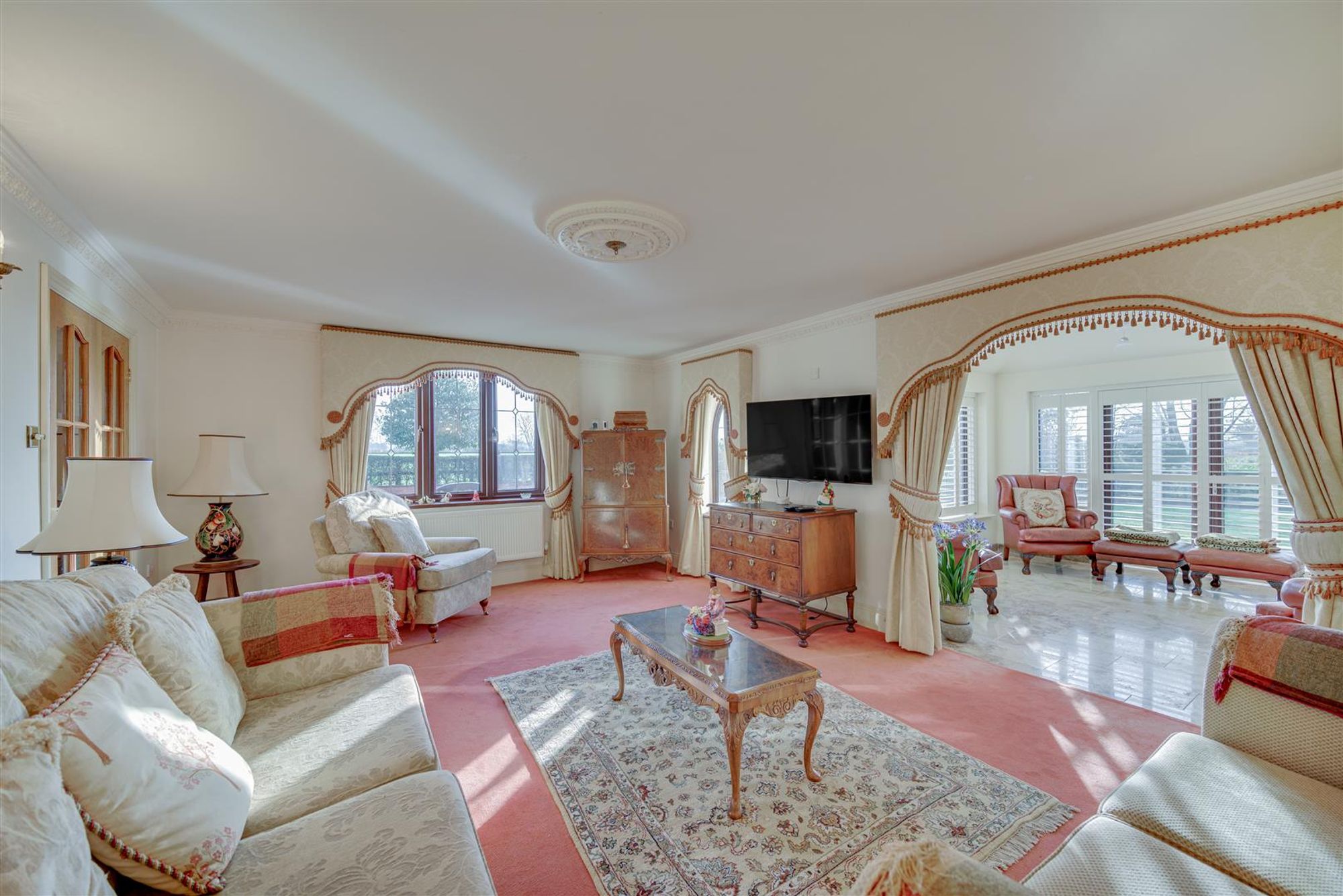 Accompanying the home are a number of features to note, some of which include: A gothic archway & entrance door, a large reception hall with wall panelling, feature glazing & hidden understairs cloaks/study, a ground floor WC, a breakfast kitchen with Corian working surfaces & 'aga' style cooker plus separate utility & formal dining room with French doors. The lounge is generous with dual aspect windows and provides access to a garden room extension having French doors, bespoke shutters and polished travertine style floor tiles with underfloor heating.