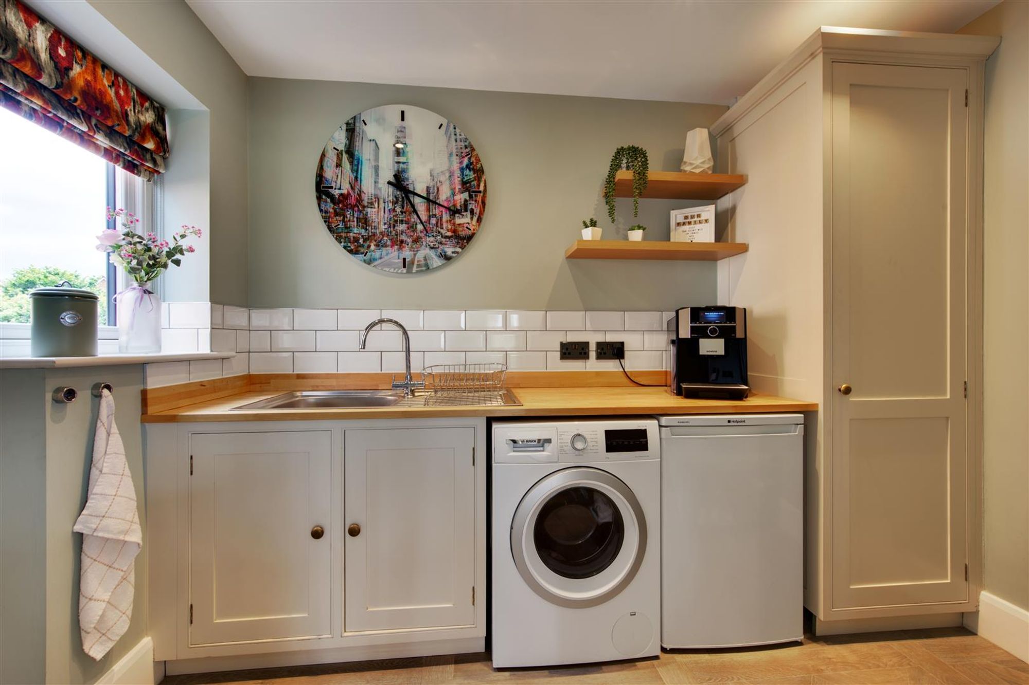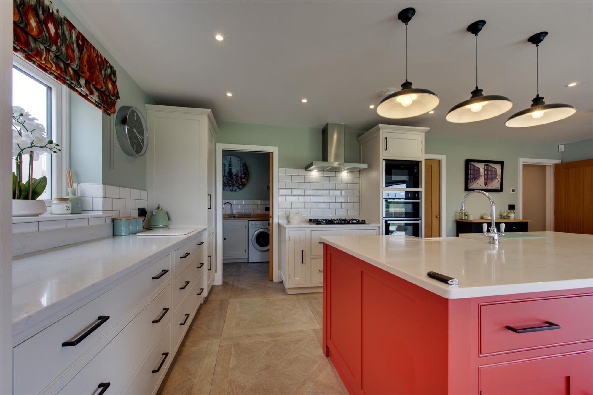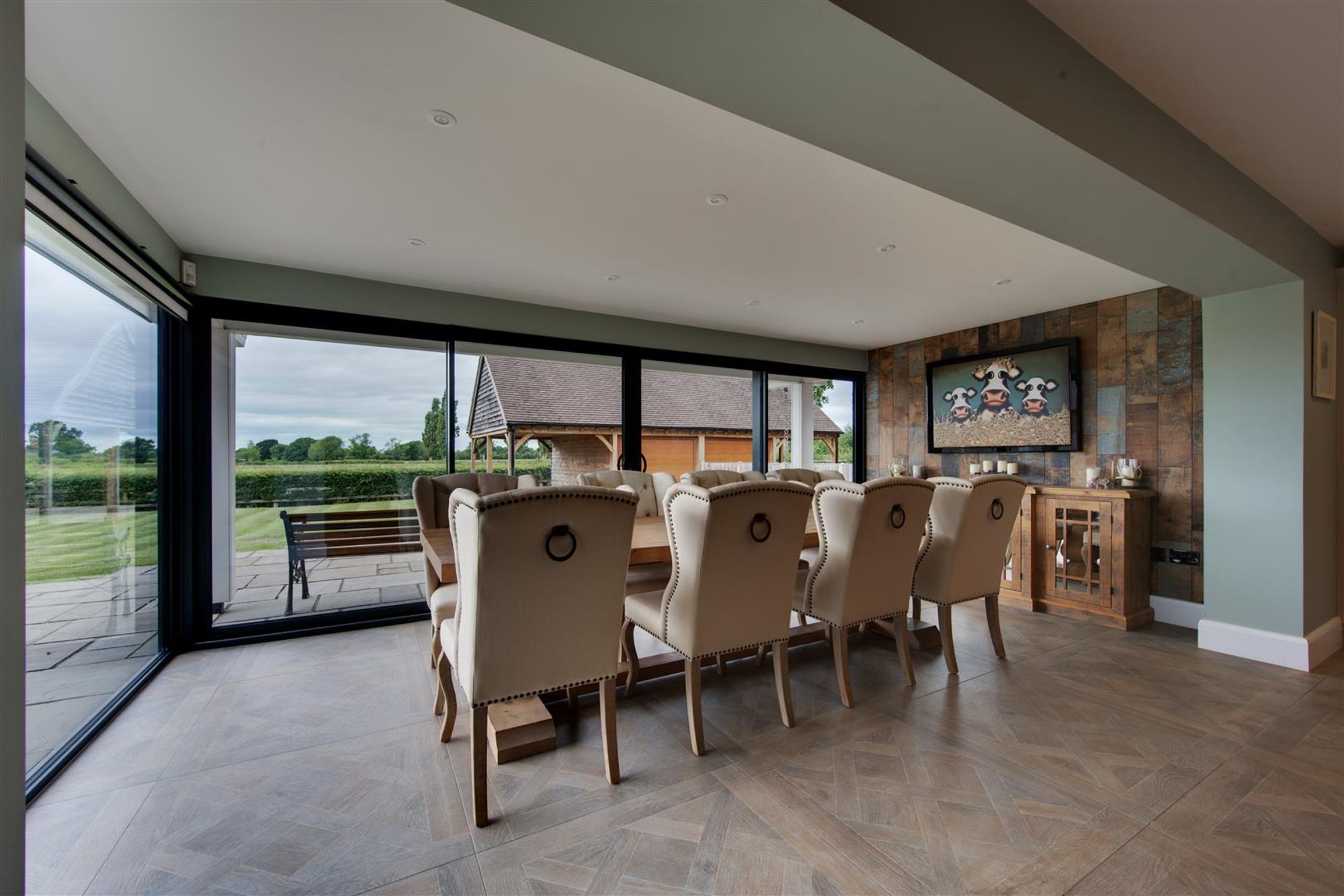 The open-plan living/kitchen dining room provides an extensive range of bespoke cabinetry, a large central island with Belfast style sink and 'Neff' integrated appliances. This wonderful room is filled with light from floor to ceiling glazed walls and sliding doors which open onto the rear garden, making this the ideal family and entertaining space!