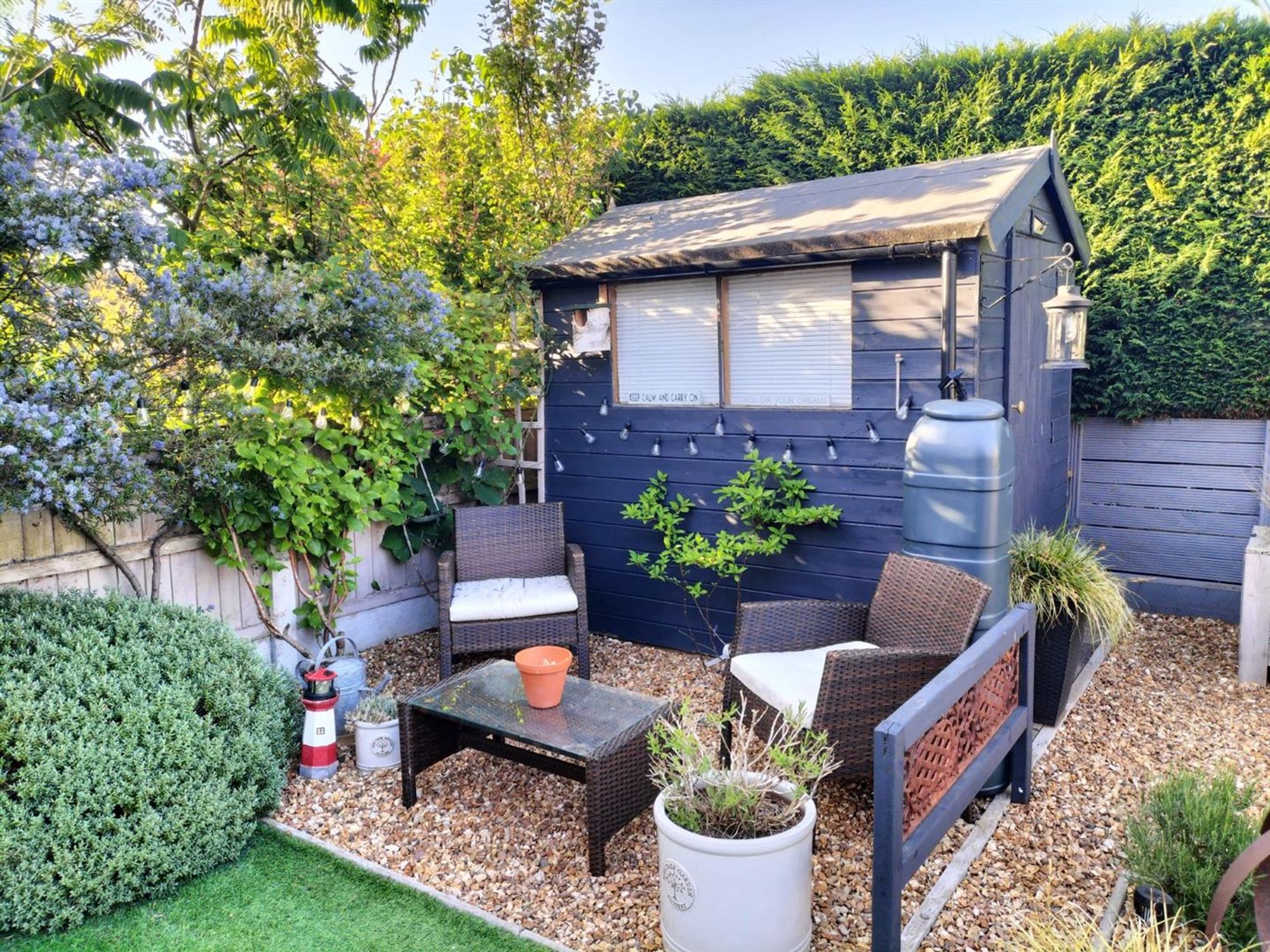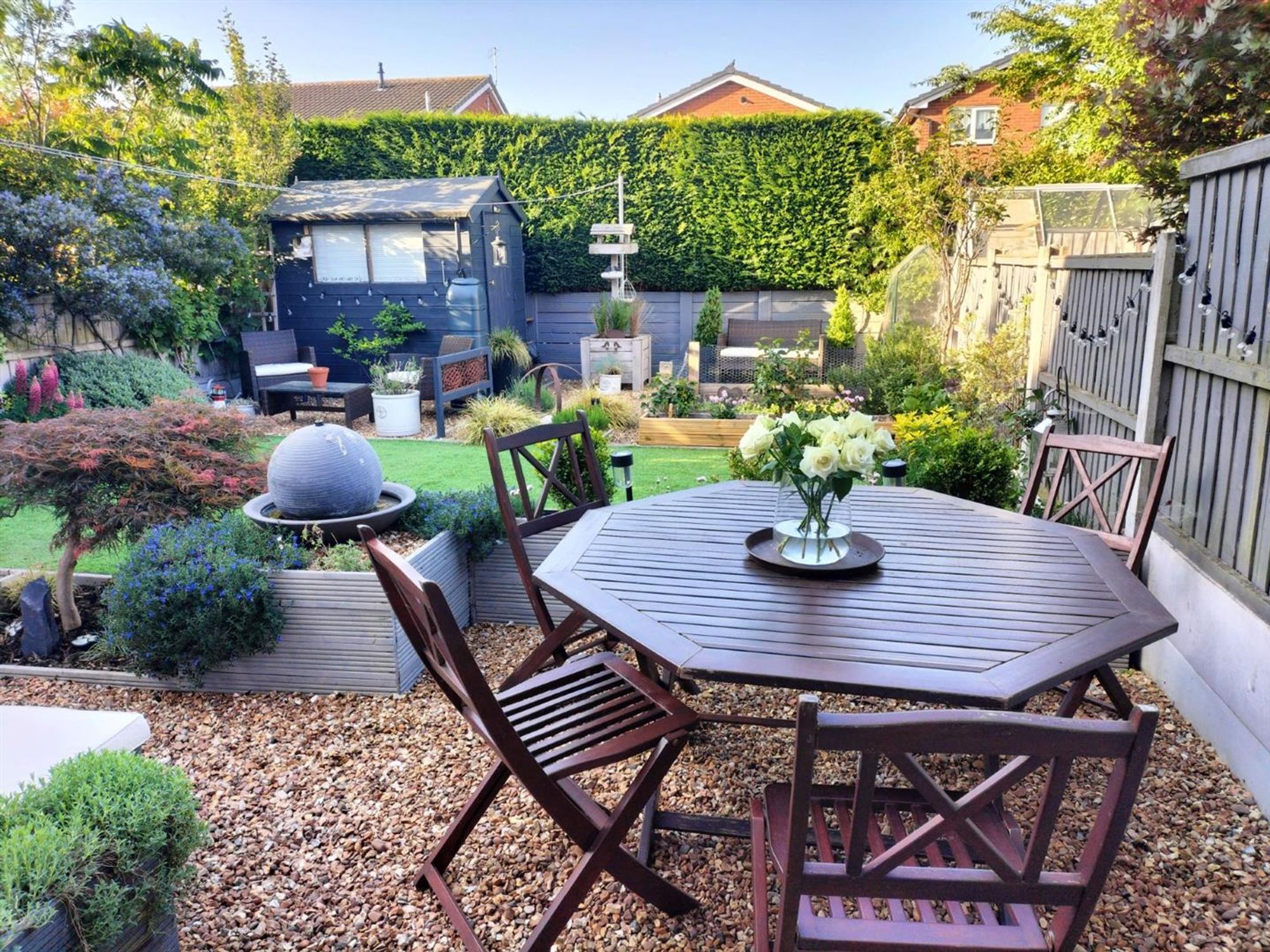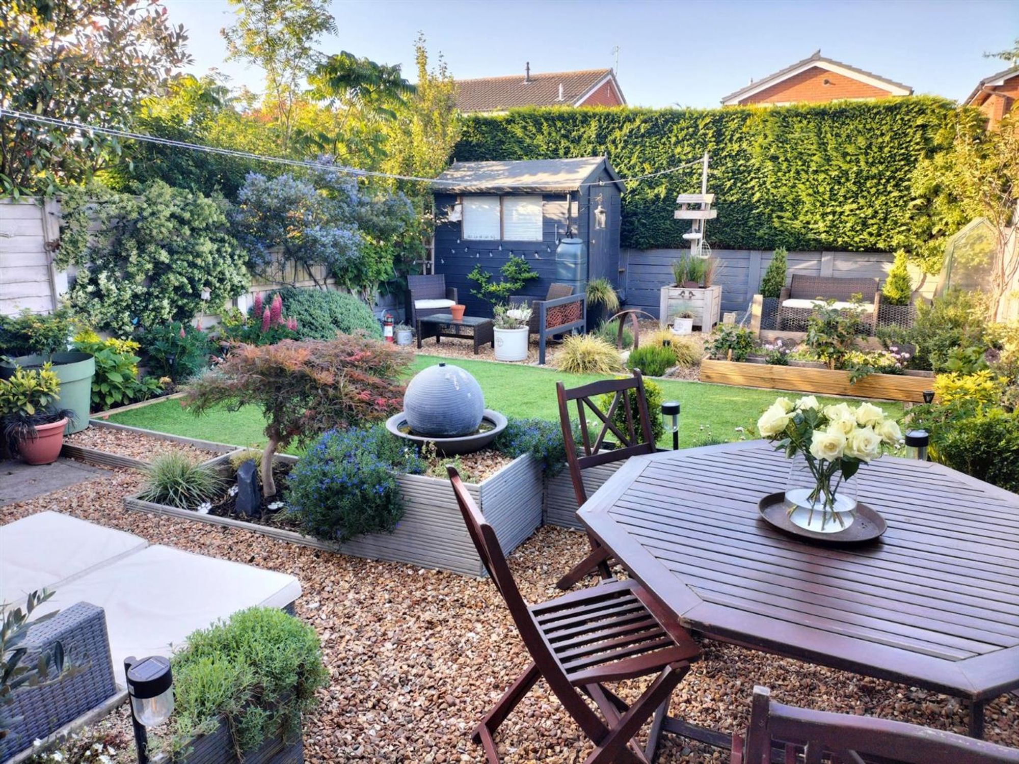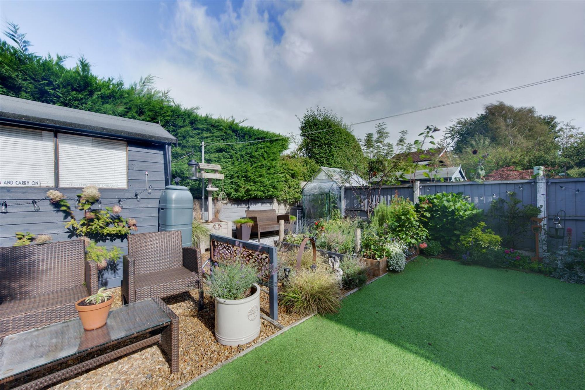 Outside the property, the gardens are a real joy and can be enjoyed all year round whilst the plot is of such a size that we feel (subject to planning permission) extending in the future could be a very interesting possibility - full of vibrant borders, various seating areas, ample storage an artificial lawned area plus a highly useful garage/workshop!
