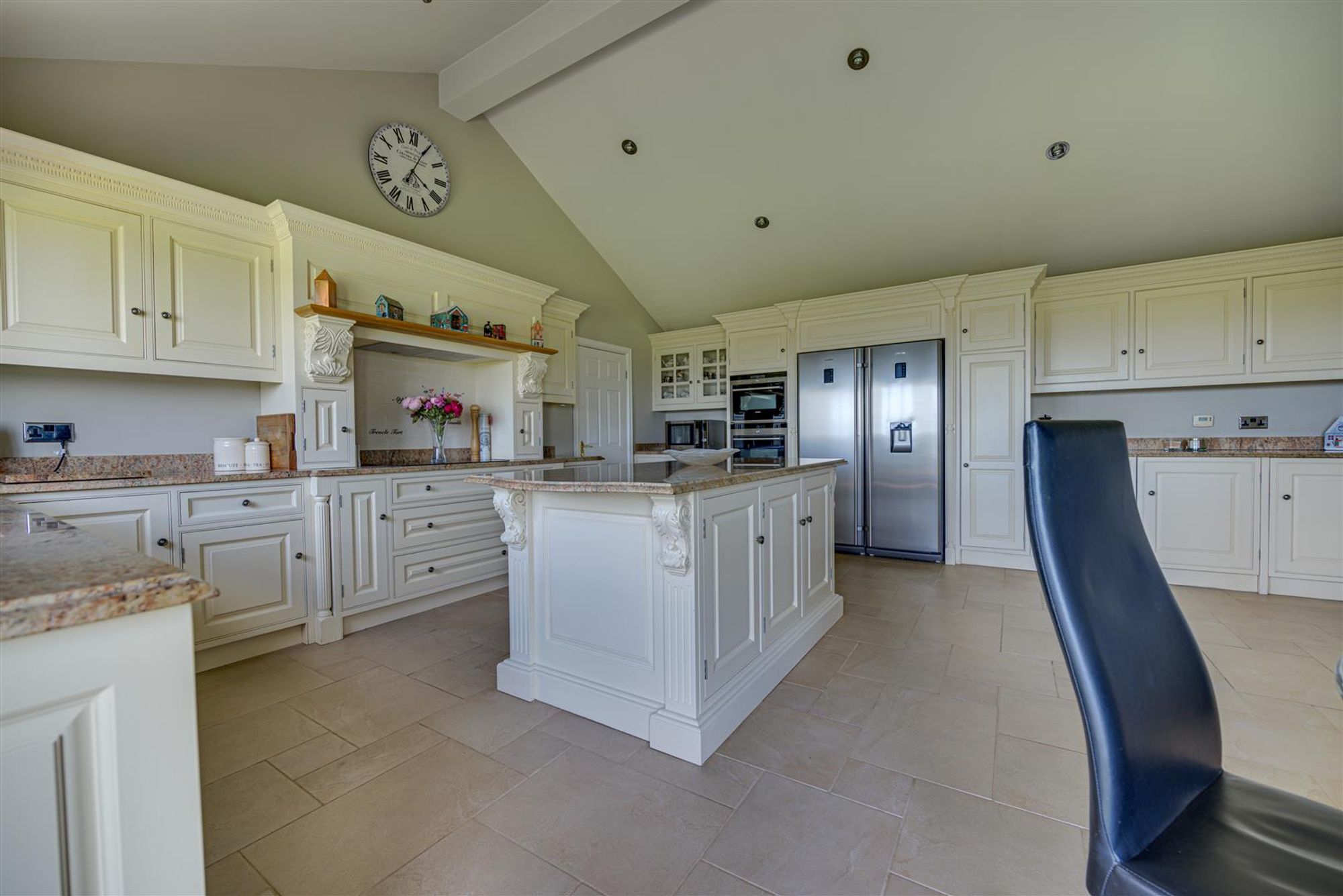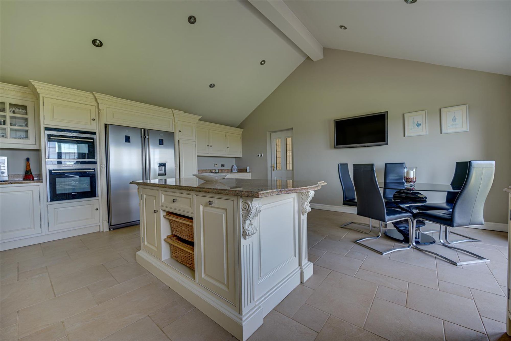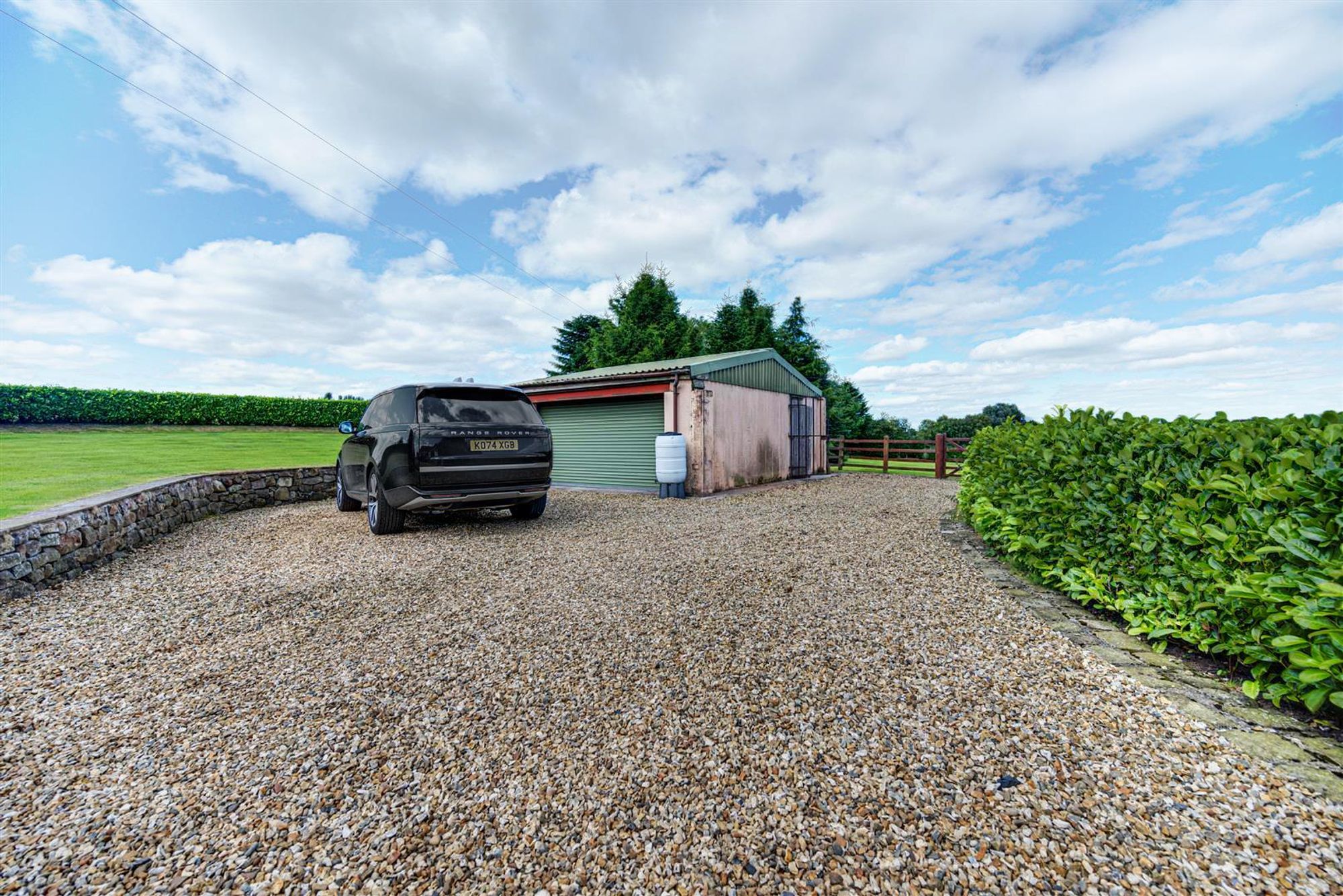 Inside, a spacious reception/dining hall flows through to an impressive multi-aspect lounge, anchored by a striking exposed brick fireplace. The expansive living dining kitchen, enhanced by vaulted ceilings, is the true heart of the home – superbly appointed with quality appliances, detailed finishes, and a generous entertaining island. Accommodation includes three large bedrooms, two luxury bathrooms, and plentiful storage, complemented by a boot room, double garage, and versatile outbuilding. The paddock offers potential for animal keeping, while the outbuilding could be adapted (STP).