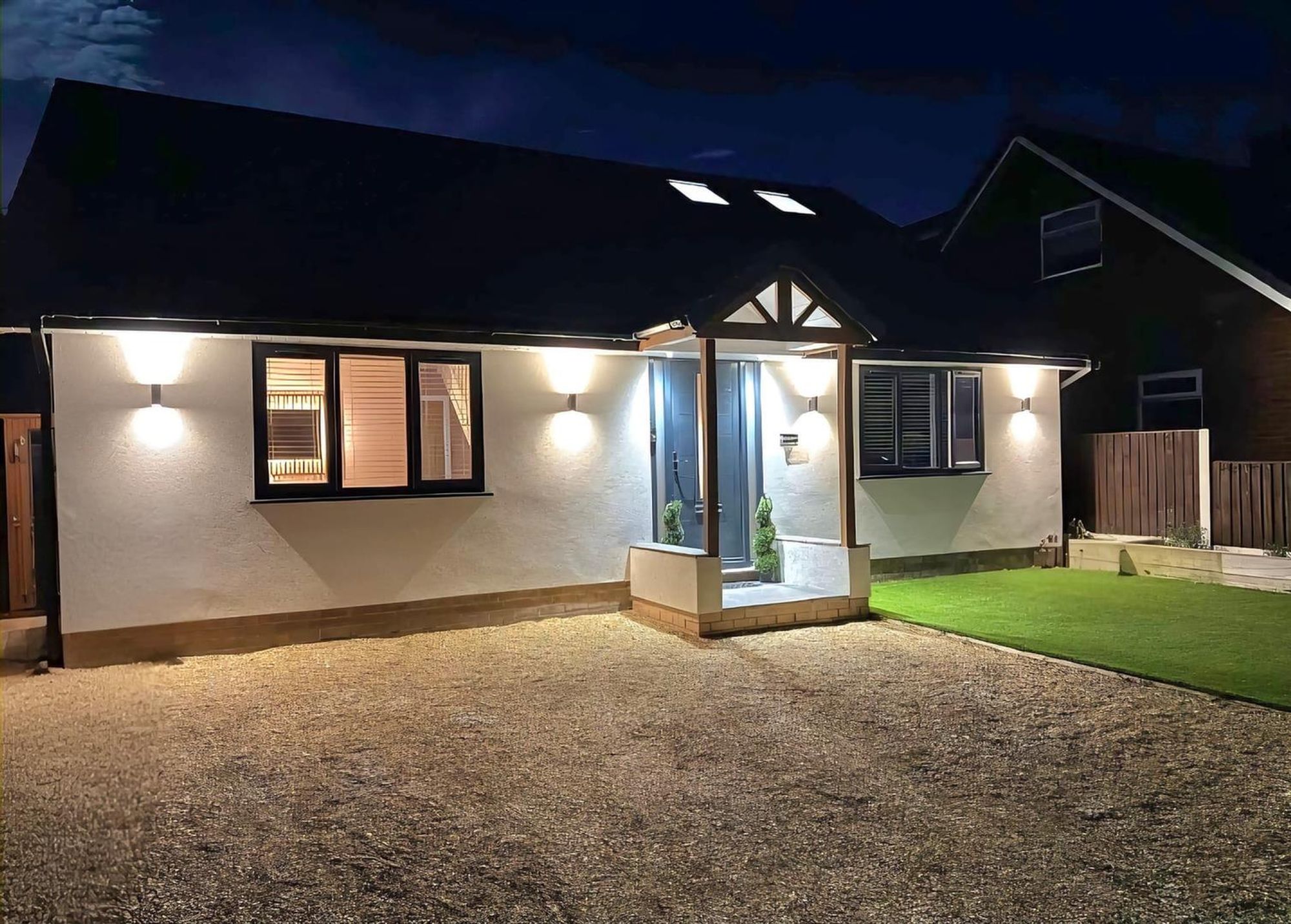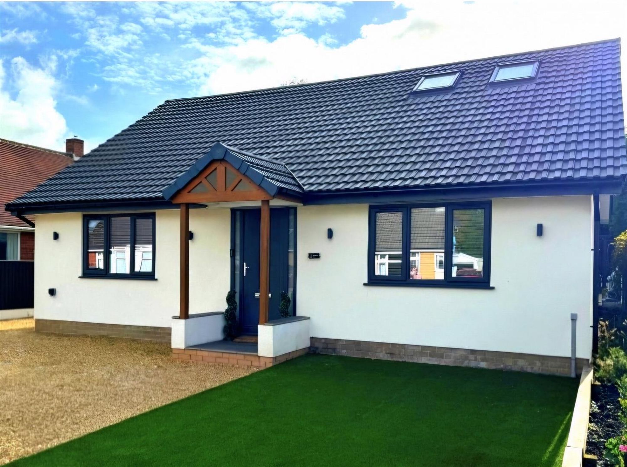 From the moment you arrive, the home’s striking exterior sets the tone: Crisp white render, anthracite double-glazed windows, a new roof, and a large driveway which can easily accommodate 3 modern cars. The entrance to the property is framed by a solid oak porch with tiled roof and recessed downlighting. The landscaped front garden features a low-maintenance artificial lawn, timber-edged planting beds, and a weatherproof mains socket - perfect for EV trickle charging.