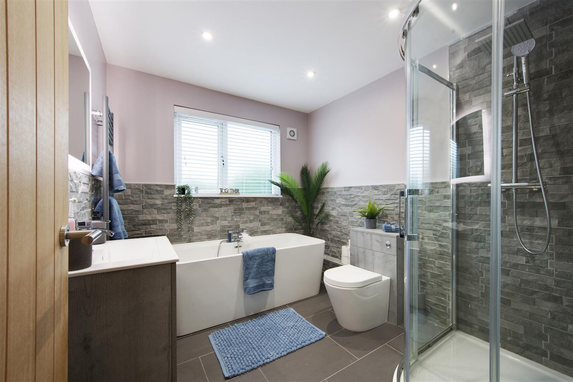 The family bathroom is a showstopper: A four-piece suite with deep freestanding bath, rainfall shower, split-face tiling, and dimmable lighting for a spa-like experience. The combination of ambient lighting, sleek fixtures, and tactile finishes creates a calming retreat - perfect for unwinding after a long day. Whether soaking in the oversized tub or enjoying the rainfall shower, this space evokes the tranquility of a boutique spa.