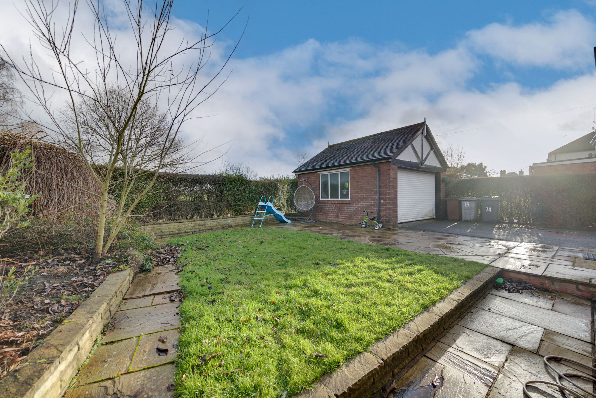 - Large detached double garage and gated driveway