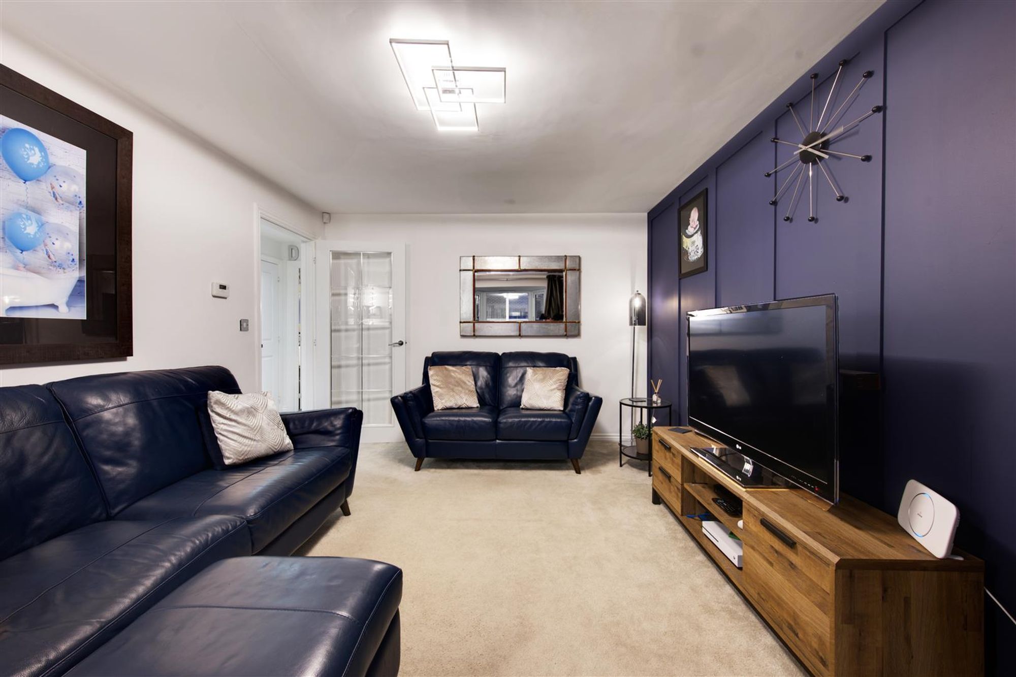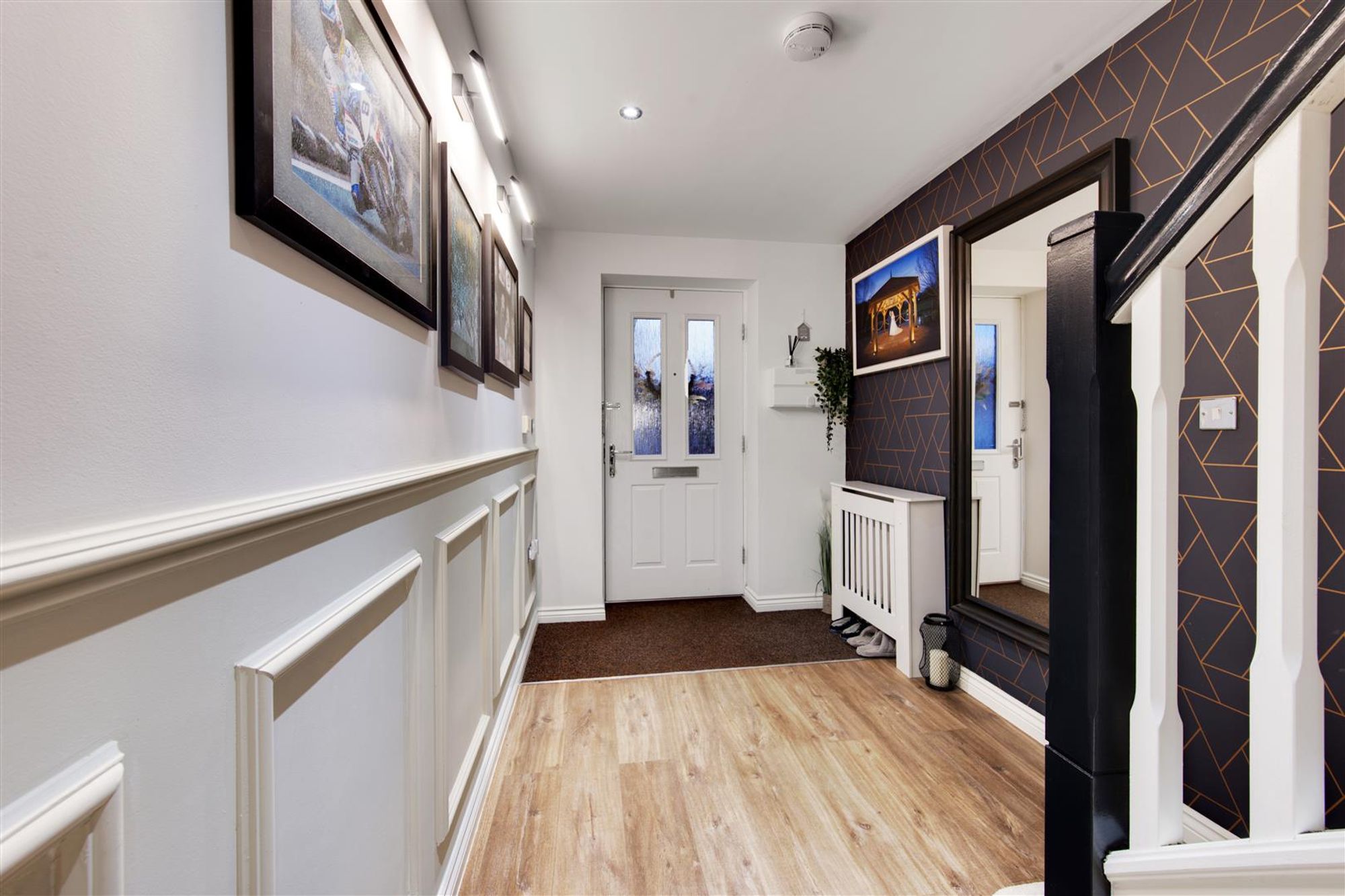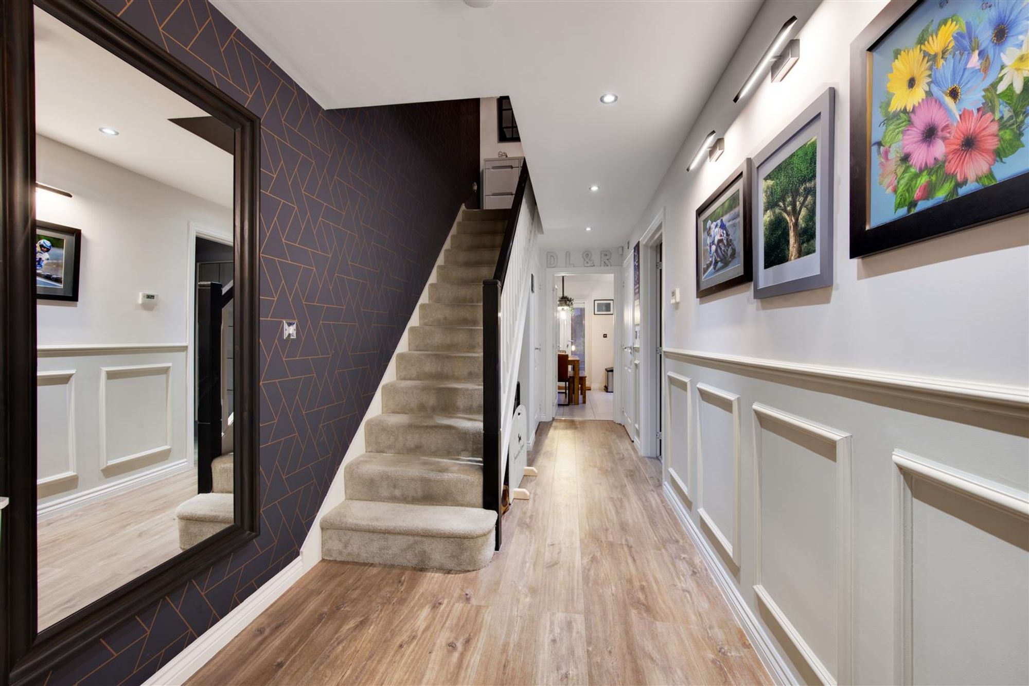 Accompanying the home are a number of features to note, some of which include: Immaculate decor throughout a welcoming entrance hall with decorative wall panelling, a large immaculately presented ground floor WC, a generous lounge towards the front of the home with beautiful decor, further wall panelling and bay window. Towards the rear of the home, the social open-plan kitchen diner can be located complete with a high-gloss fitted kitchen, plenty of storage and a wealth of integrated, branded appliances. The entire space has a georgeous tiled floor and the dining area has French doors leading to the rear garden and a separate utility keeps this entire space fully organised.